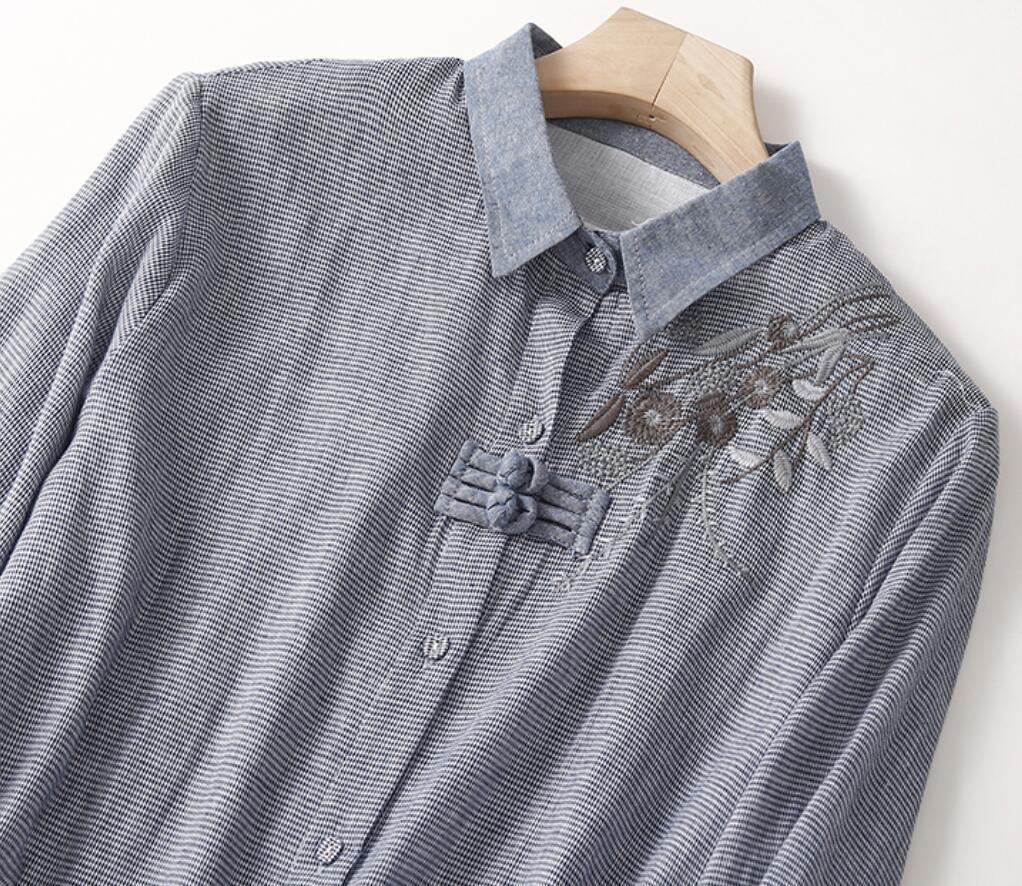 新入荷~ 綿麻 シャツ 刺繍り レディース ブラウス チュニック チェック柄 長袖 リネン シャツ チュニック ナチュラル きれいめ~XL