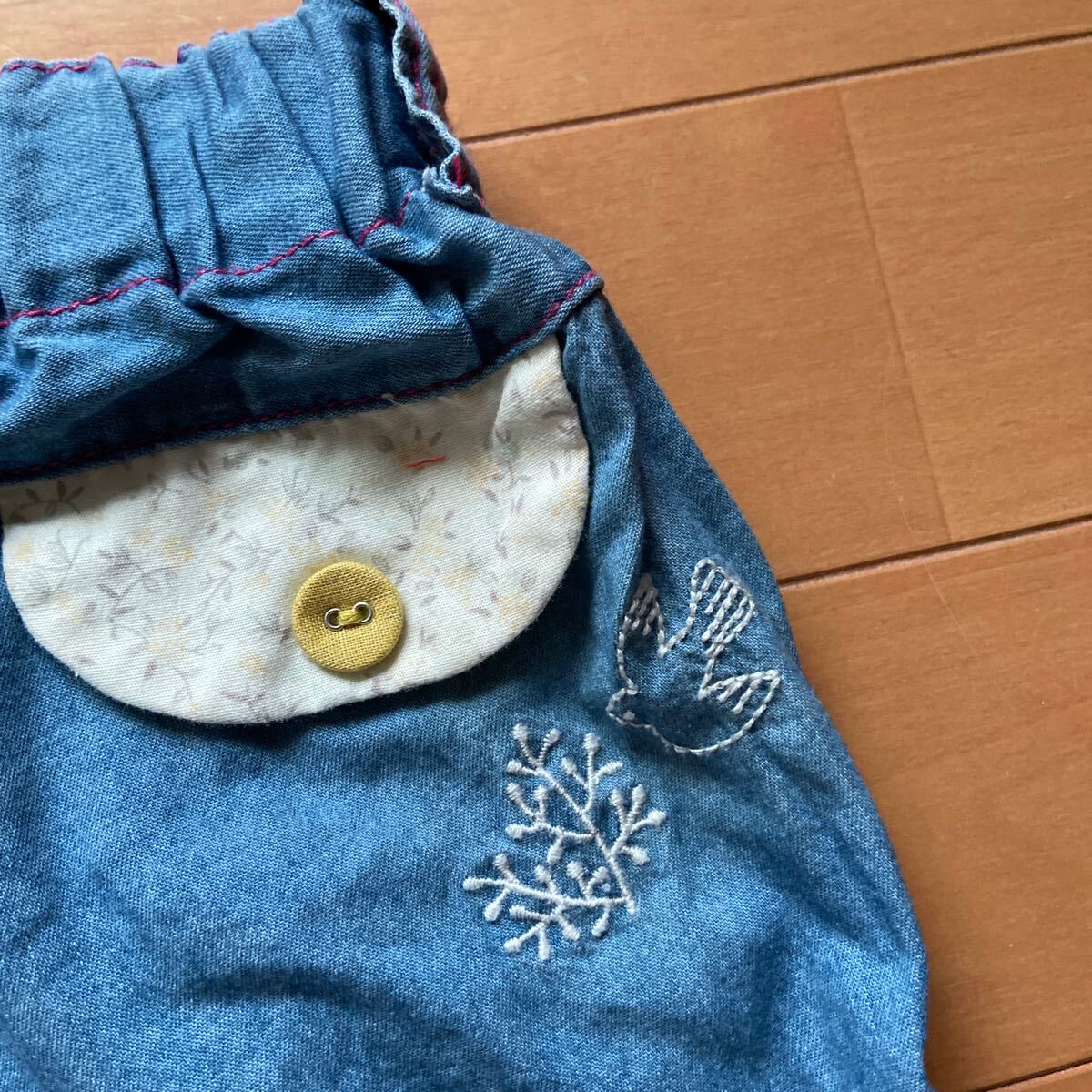 ところどころに小花柄の生地をあしらったデザインでフリルとピンクのステッチやお尻のところにさりげなく入った刺繍もポイントになっています。