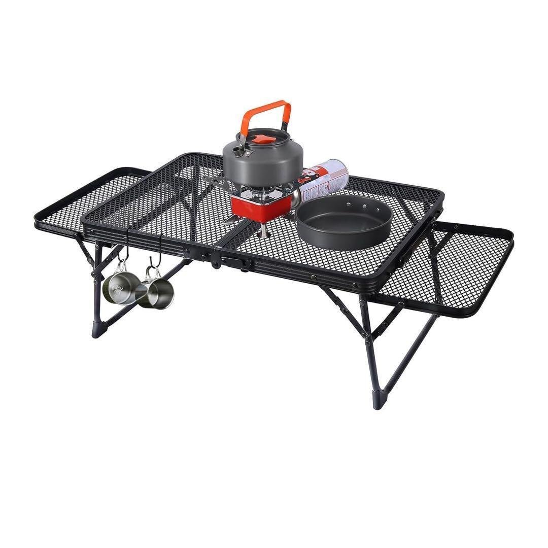 アルミ製キャンプテーブルは、軽さかつ耐久性に優れているのが特徴。手触りがよくて傷や汚れがつきにくく、メッシュ天板デザインで耐熱温度が300℃まで達し、錆びにくい、水と熱にも強いので、調理したばかりのフライパンや鍋をその上に置くのもオッケー。おしゃれな見た目でお手入れも簡単、汚れても丸々水洗いができ、実用性と耐久性を両立しています。