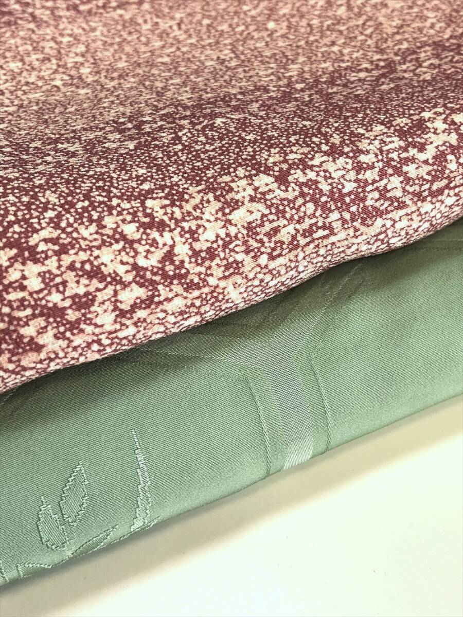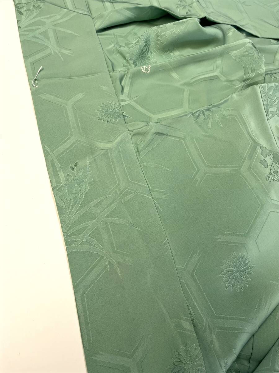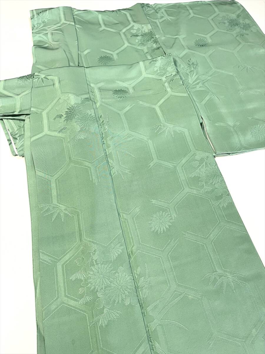 破れ亀甲に蘭と菊と笹が織り出された紋意匠の色無地です。一つ紋付きです。