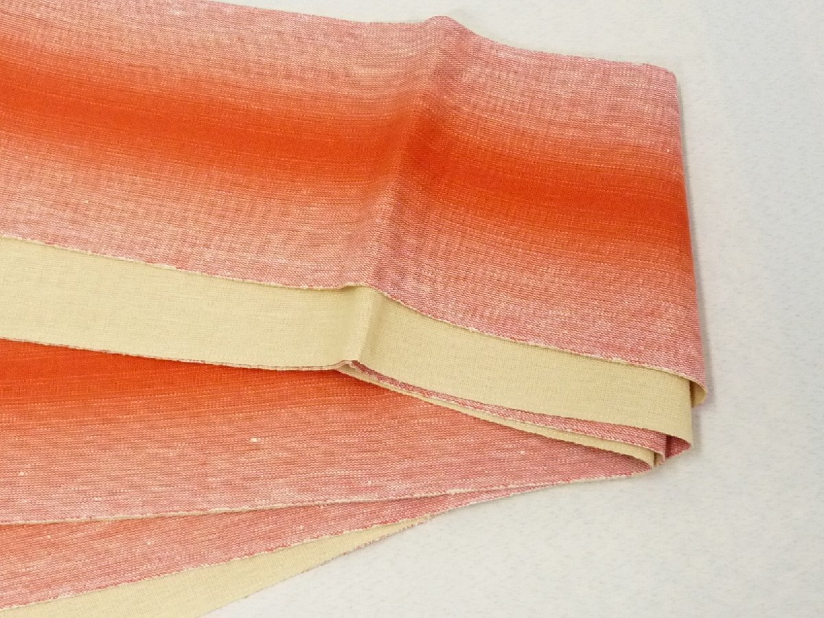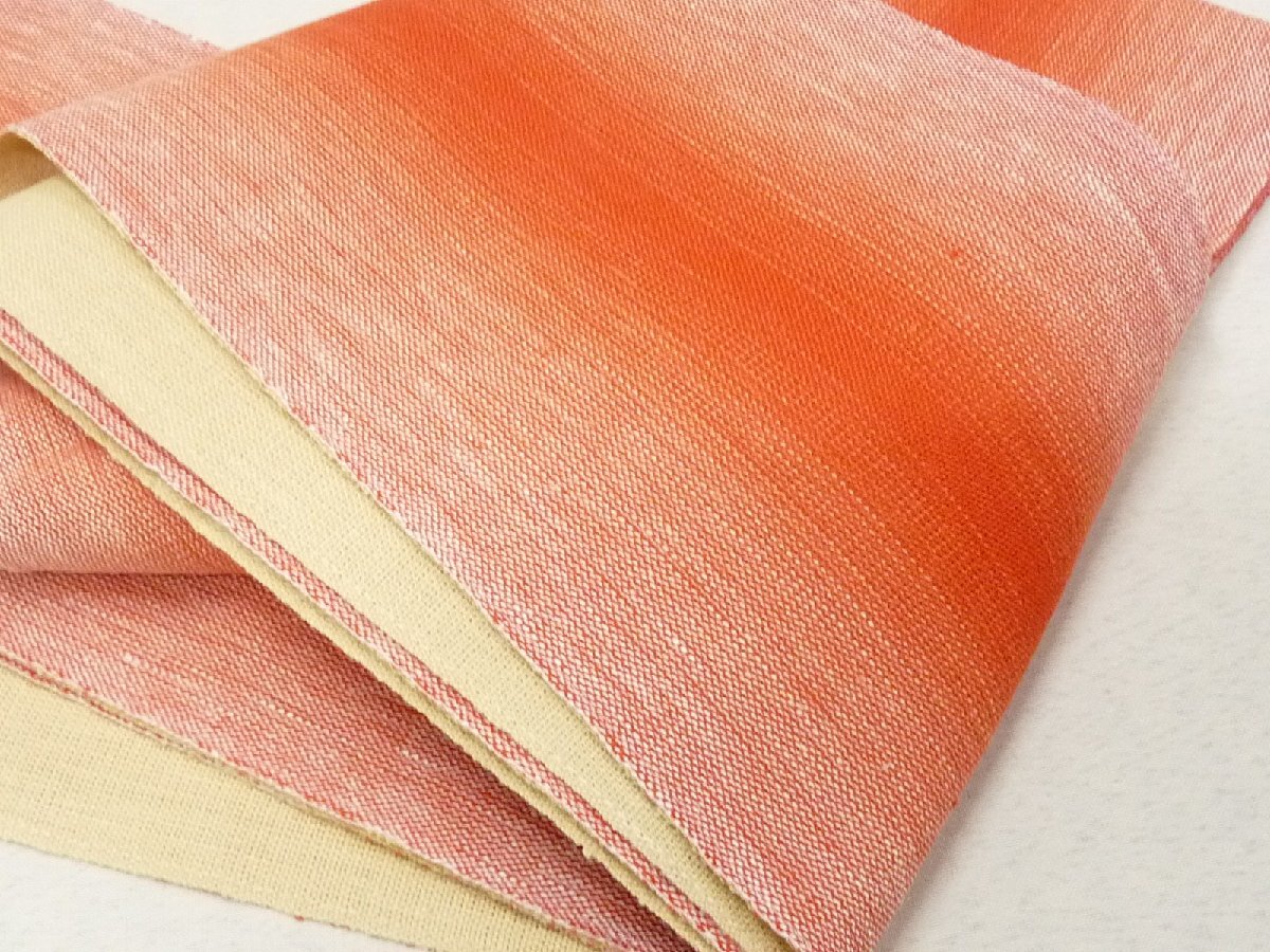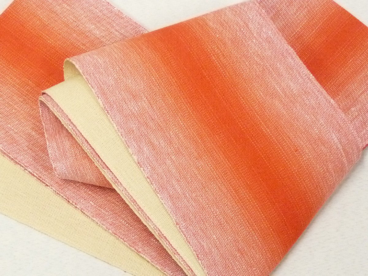 商品名 まゆの四季/日本製/新品/長尺/細帯/半幅帯/本麻-JKジュンココシノ麻ぼかし-朱赤RE | ||