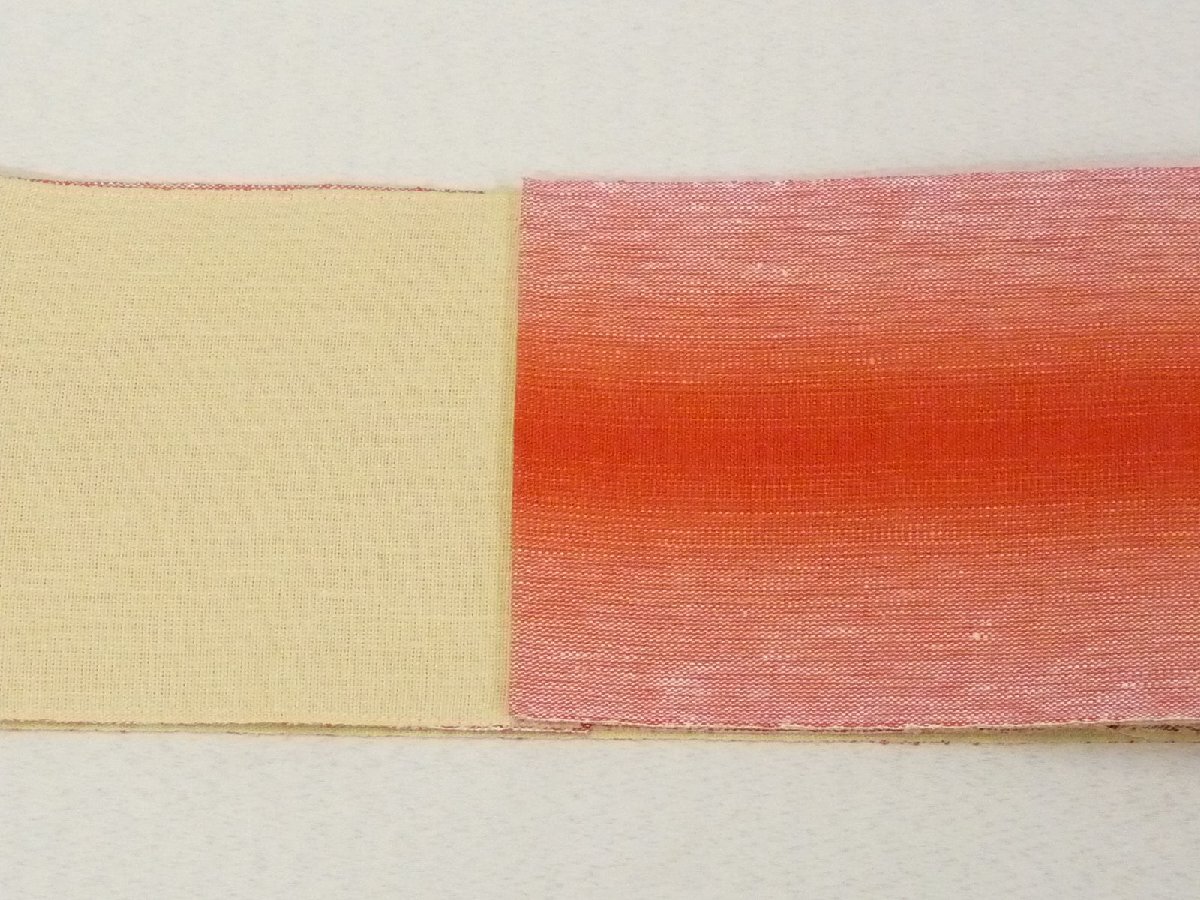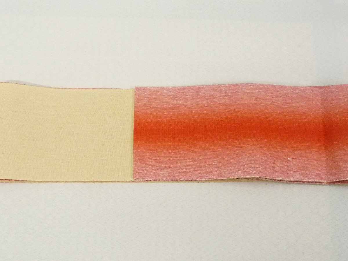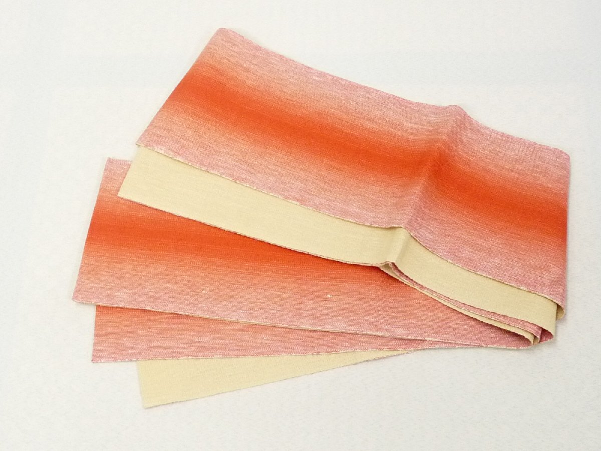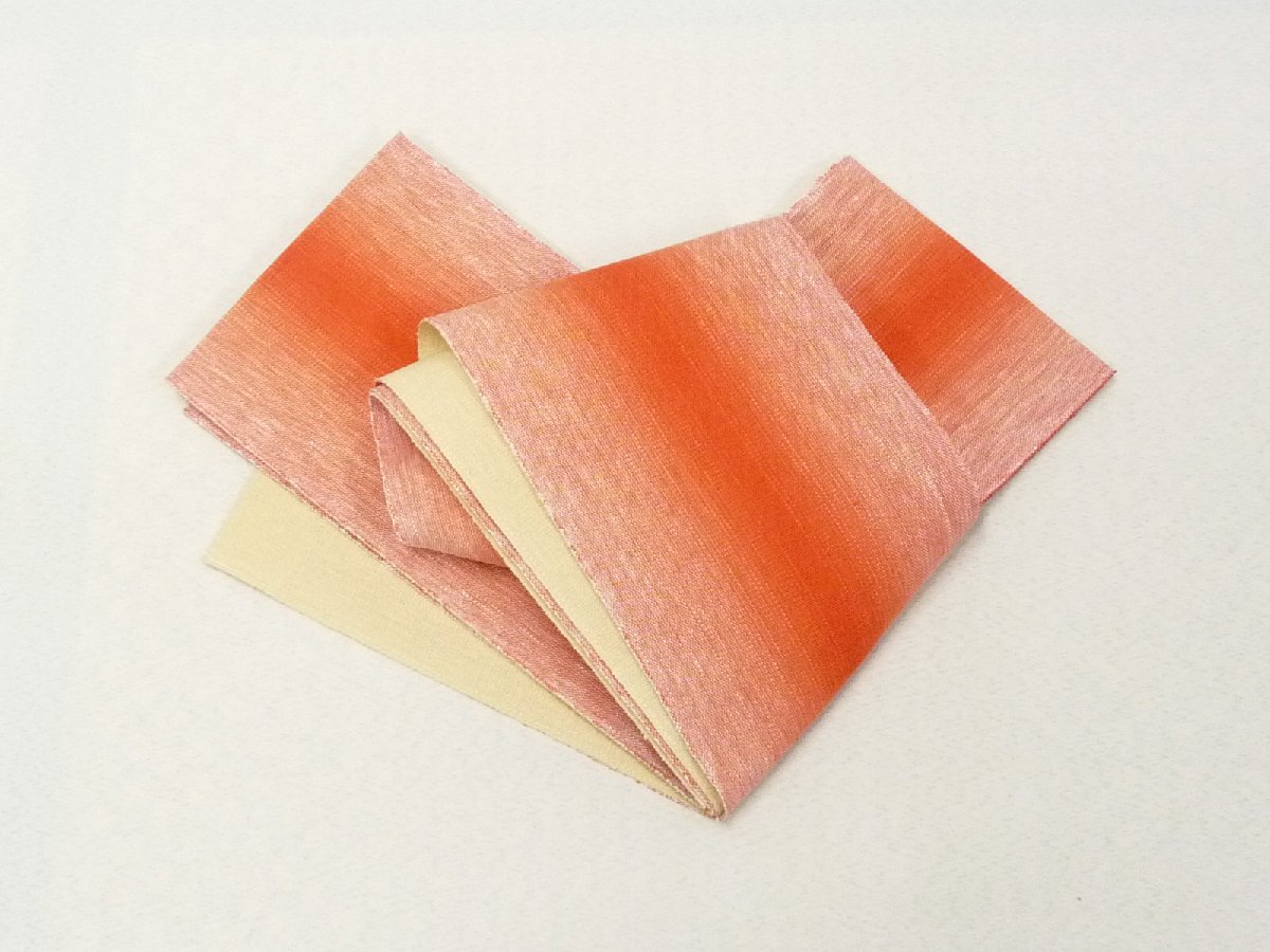 商品名 まゆの四季/日本製/新品/長尺/細帯/半幅帯/本麻-JKジュンココシノ麻ぼかし-朱赤RE | ||
