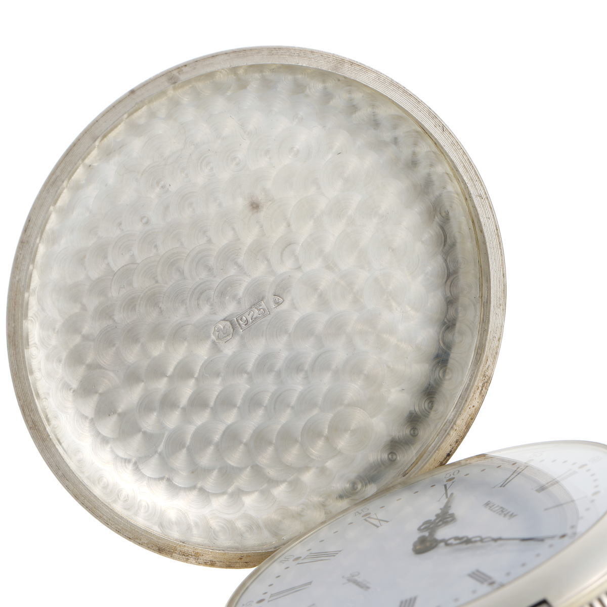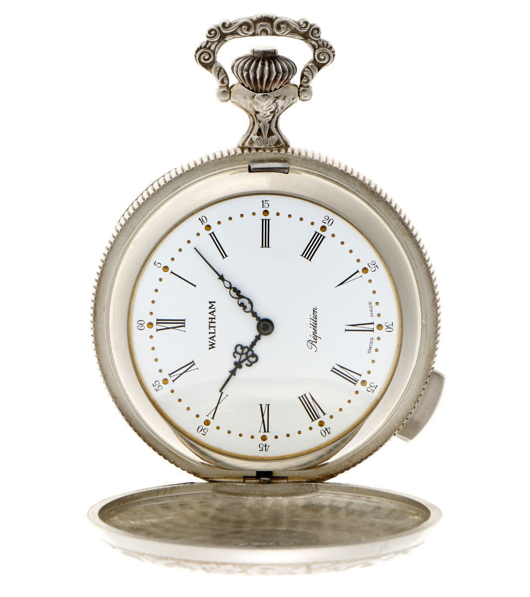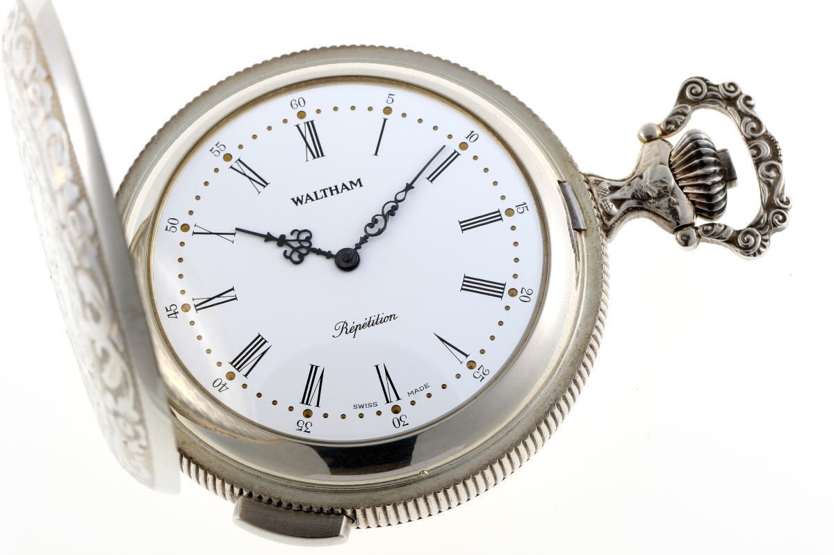 細かい小傷があります。12時側ケースサイドに打ち傷があります。提携工房にてオーバーホール済み。-ウォルサムの機械式ポケットウォッチ。鐘の音で時間を知らせるミニッツリピーター。ホワイトダイアル。スターリングシルバー製。
