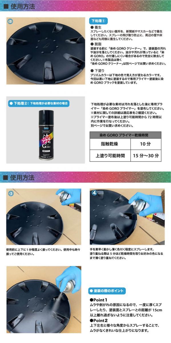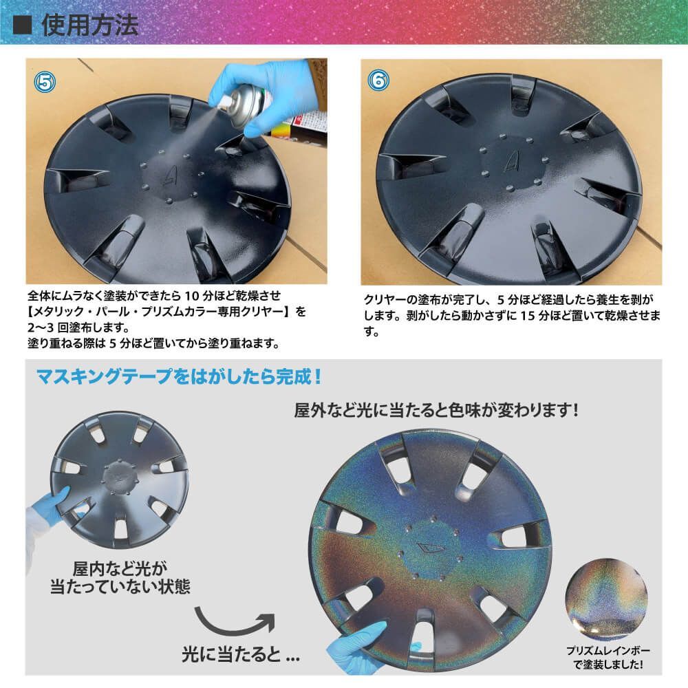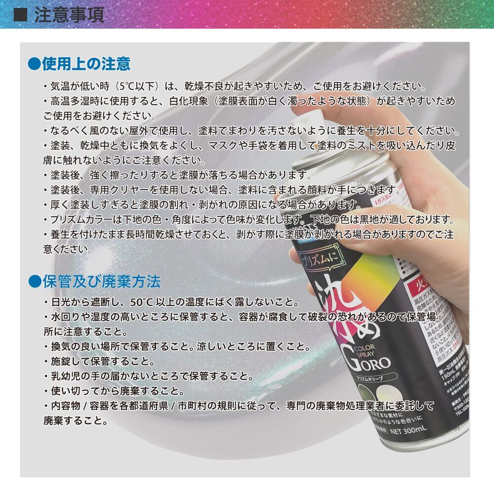 ・プリズムカラーは下地の色によって色味が変化します。下地が黒色のみのカラーは色の薄い下地に塗装すると発色が良くありませんのでご注意ください。