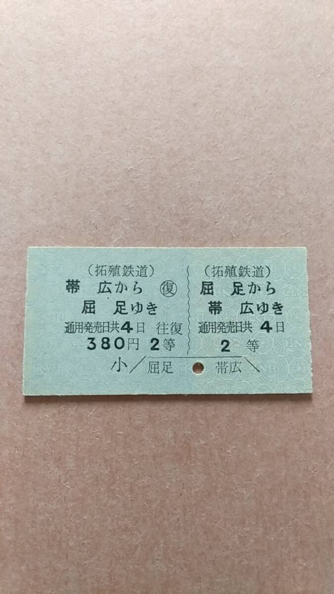 拓殖鉄道 往復 屈足⇔帯広 2等 380円 屈足駅発行