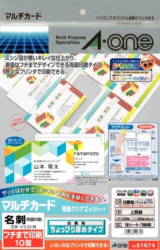 ◆ミシン目が無いキレイな仕上がり。表面はフチまでデザインできる両面印刷タイプ。色々なプリンタで印刷できる。 / ■ 仕 様 ■対応プリンタ:インクジェット(染料/顔料)、レーザー、コピー、熱転写、ドット入数:10シート(100枚)シートサイズ:A4判 (210×297mm)一片サイズ:55mm×91mm面付:10面 2列×5段厚み:255g/m2(0.28mm)ラベル・カード厚み:0.20mm材質:上質紙用紙特性:マット、両面印刷白色度:99% / ※顔料インクでは、表面素材の特性上、インクが乾きにくいので、印刷面にはできるだけ触れないようにしてください。 |