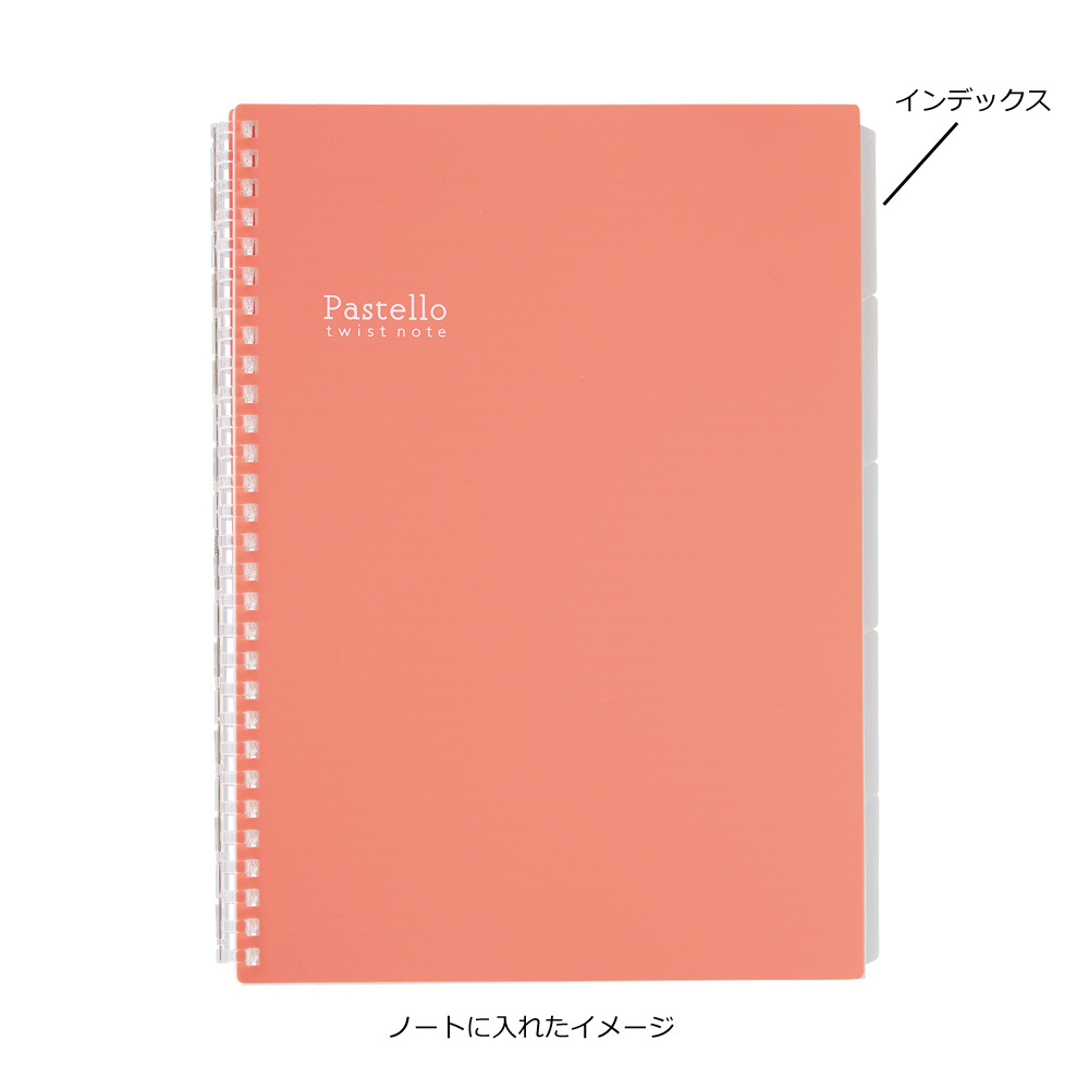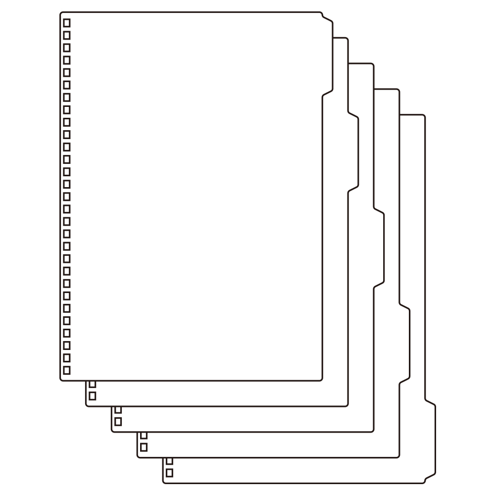 ツイストノートと同じ穴数が開いた5ツ山インデックスです。表紙から7mm幅のインデックス山が出るので、マスキングテープ(幅15mmを2つ折り)を貼って色別したり、直接油性ペンで記入ができます。専用インデックスを使えば授業用のノートは科目別に、ビジネス用ノートは得意先やプロジェクト別などに仕分けすることができます。