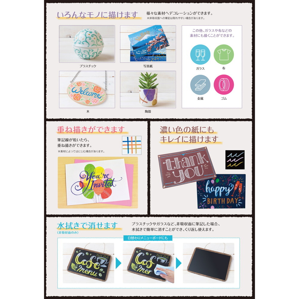 ○プラスチックやガラスなど非吸収面に筆記した場合、水拭きで簡単に消すことができ、くり返し使えます。