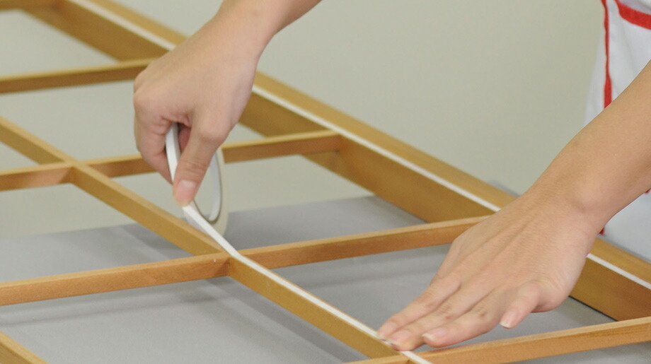 ●障子枠が湿っていたり、「はがし剤」や「洗剤」が残っていると接着しないことがありますので、水ぶきをした後、枠を充分に乾燥させてから貼ってください。