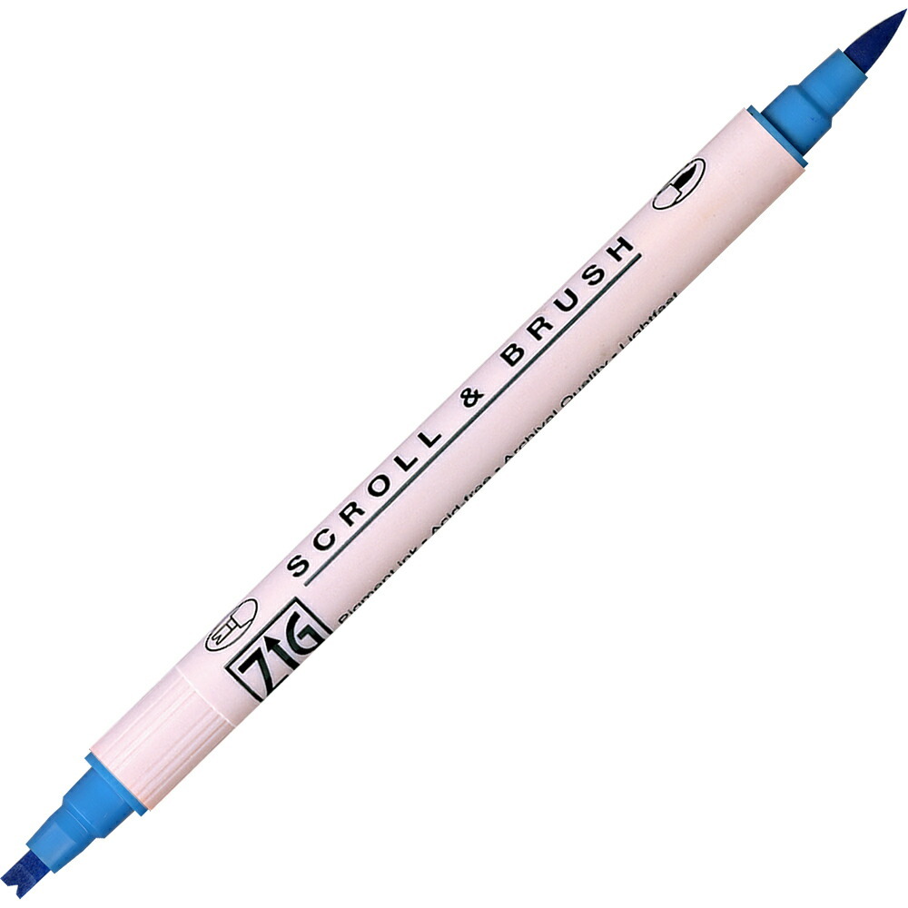 ペン先が分かれたスクロール芯と、絵筆タイプのブラッシュ芯のツインマーカー。 カリグラフィーや、スタンプのカラーリング、イラスト描きなど幅広く使えます。