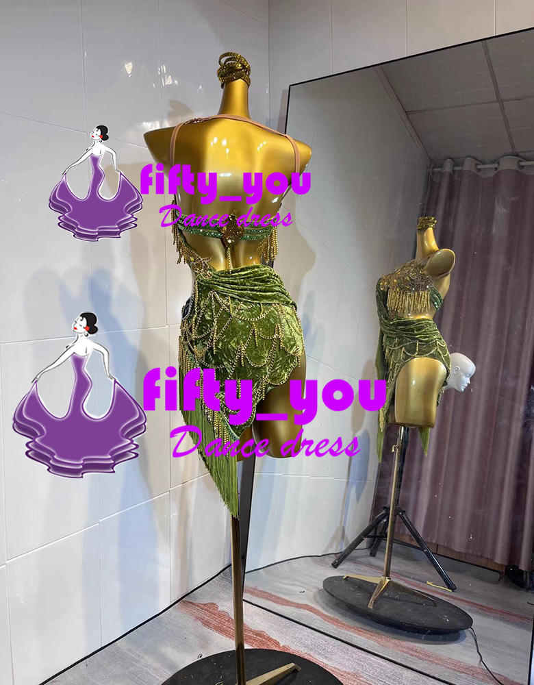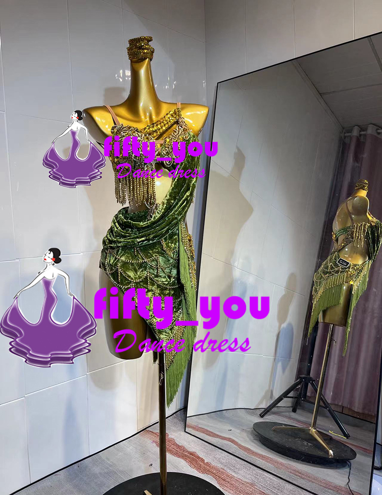 新品fifty_you 魅力サイズセミオーダー ハイクオリティレディース社交ダンス衣装 ラテン競技ドレス ビーズ飾り グリーン系