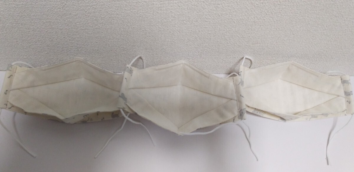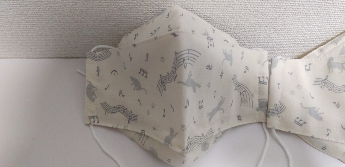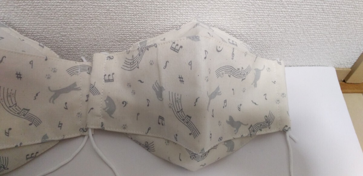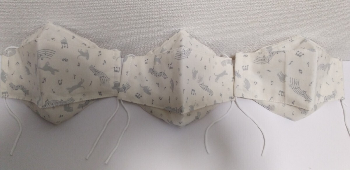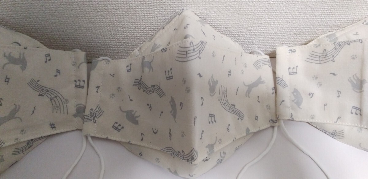 ハンドメイド  クリーム色に薄いグレー色の音符&猫柄生地の3Dマスク3枚セットです。内側はクリーム色のダブルガーゼです。両サイド紐通せて鼻部分にワイヤー入れてます。マスクゴムもお付けします。