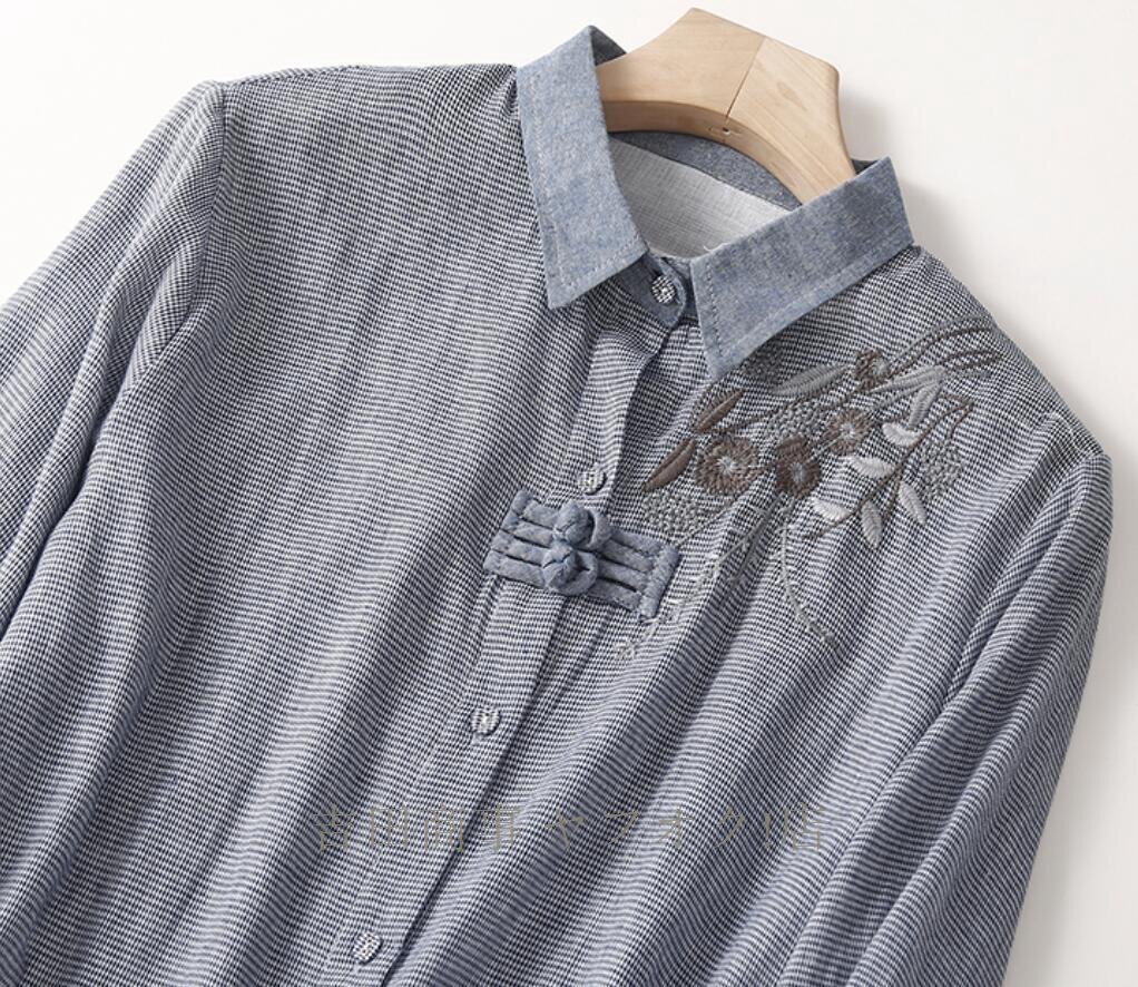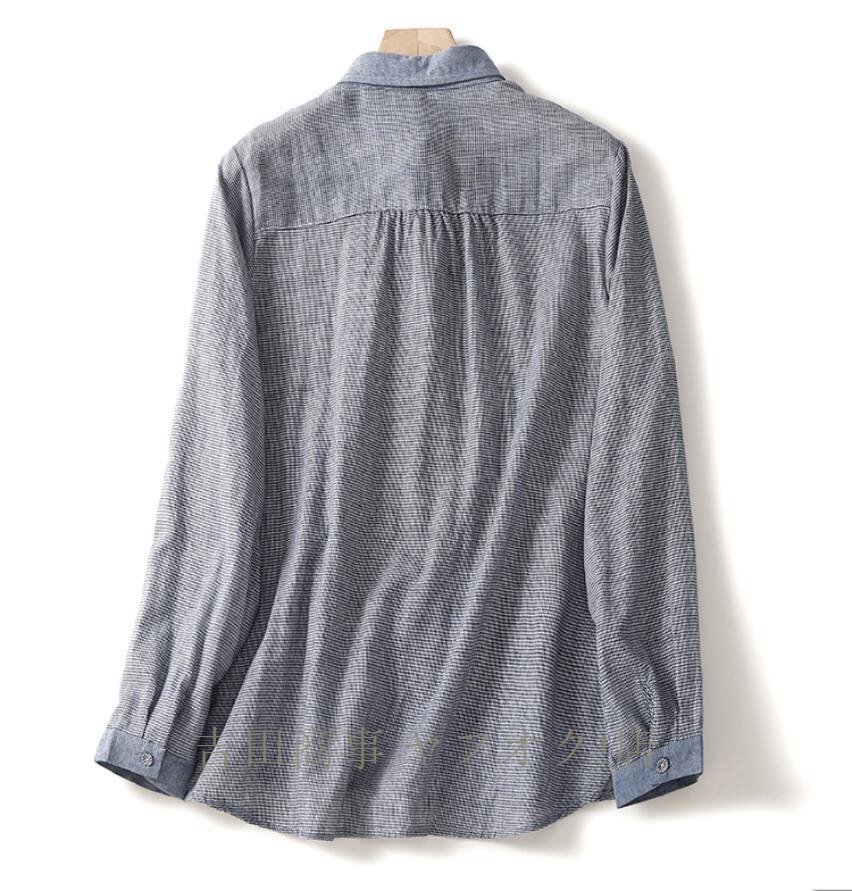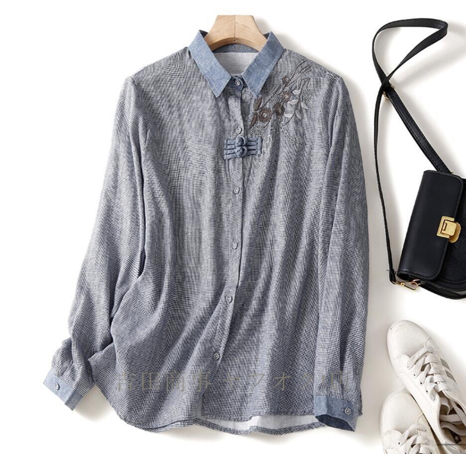 A1200☆新品綿麻 シャツ 刺繍り レディース ブラウス チュニック チェック柄 長袖 リネン シャツ チュニック ナチュラル きれいめ XL