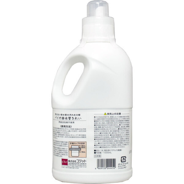 見えない排水管の汚れを分解!! 環境のこと、ラクしてきれいを保つこと。 両方考えて作られました! 配水管キレイは環境に配慮しながら、見えない配水管の隅々まできれいに! 本品のバイオは商品に含まれる栄養分を利用して、カビを抑制する物質を発生します。 その働きで空間をクリーンに保とうとするものです。 ・界面活性剤不使用。 ・排水口から流しいれるだけ! ・排水管の中にバイオの微生物が定着して、カビや汚れをじっくり食べてくれる! ・ほとんど無臭。 ・手肌に優しい。 ・配水管に優しい。 ・環境に優しい。 個装サイズ:117X255X83mm 個装重量:1110g 内容量:1000mL 製造国:日本 【発売元:株式会社コジット】 【使用方法】 (1)はじめの3日間は60mL(キャップ2杯)を排水口に円を描くように流し込んでください。 続いて排水口に30~40度のお湯を500mL程度流してください。 (2)その後週2~3回を目安に30mL(キャップ1杯)を排水口に流し込み、続いて排水口に30~40度のお湯を500mL程度流してください。 ※本品をより効果的にお使いいただけるよう、就寝前やお出かけ前など、その後排水口を使用しない時間帯にご使用になることをお勧めします。 ※バイオ(微生物)が沈殿する場合がありますので、先に容器を軽く振ってからご使用ください。 【成分】 水、微生物(バチルス菌属) 【使用上の注意】 ・バイオは生き物です。 環境によって活動が変化するため、効果が実感できる時期は状況によって異なります。 ・環境下に汚れや悪臭の原因となる物質等の有機物が異常に多い場合、効果を感じるのに時間がかかります。 ・即効性のあるものではありません。 ・バイオが死滅する為、強酸、強アルカリのパイプ洗浄剤、漂白剤、殺菌剤、消毒剤とは併用しないでください。 ・商品の特性上、分離することがあります。 軽く容器を振ってからご使用ください。 ・別の容器に移し替えないでください。 誤用や劣化の原因となります。 ・本品が直接目に入った場合は、清潔な水で十分洗浄し、医師の診断を受けてください。 ・本品は飲料用ではありません。 万一誤飲した場合はコップに1-2杯の水を飲み、医師の診断を受けてください。 ・お子さまの手の届かない所で保管してください。 ・直射日光のあたらない冷暗所に密栓して保管してください。 ・使用後石けんで手を洗ってください。 注意事項 予告なく成分・パッケージが変更になることがございます。 予めご了承ください。 *予告なく成分・パッケージが変更になることがございます。予めご了承ください *ダンボールを使用して発送する場合には、入数以下の個数の場合、 中古ダンボールを使用する場合があり、ご注文の商品とは異なるダンボールになる場合があります。 あらかじめ、ご了承ください。 |