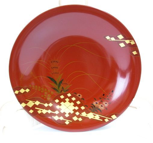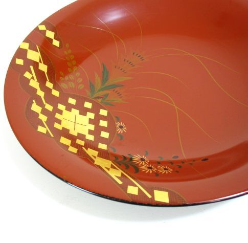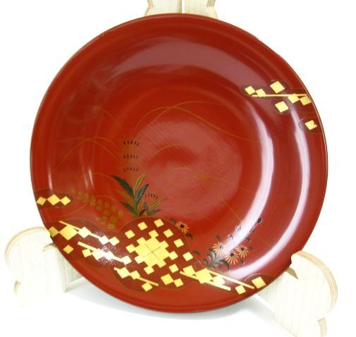 【未使用】大内塗 丸鉢 丸皿 山口県 特産品 伝統工芸 金箔菱文 秋草絵 直径≒29cm 漆器 菓子皿 丸皿 和食器