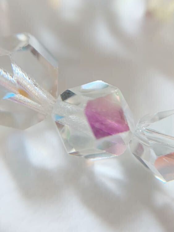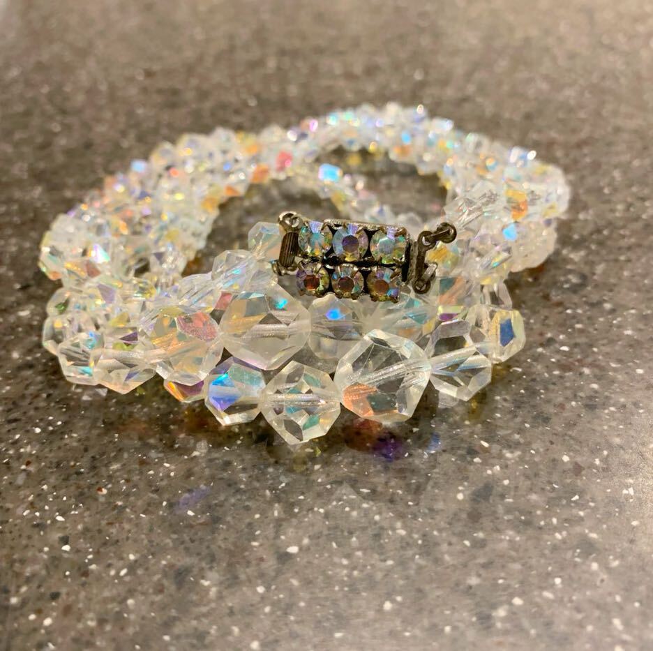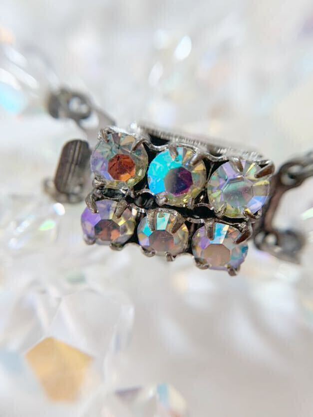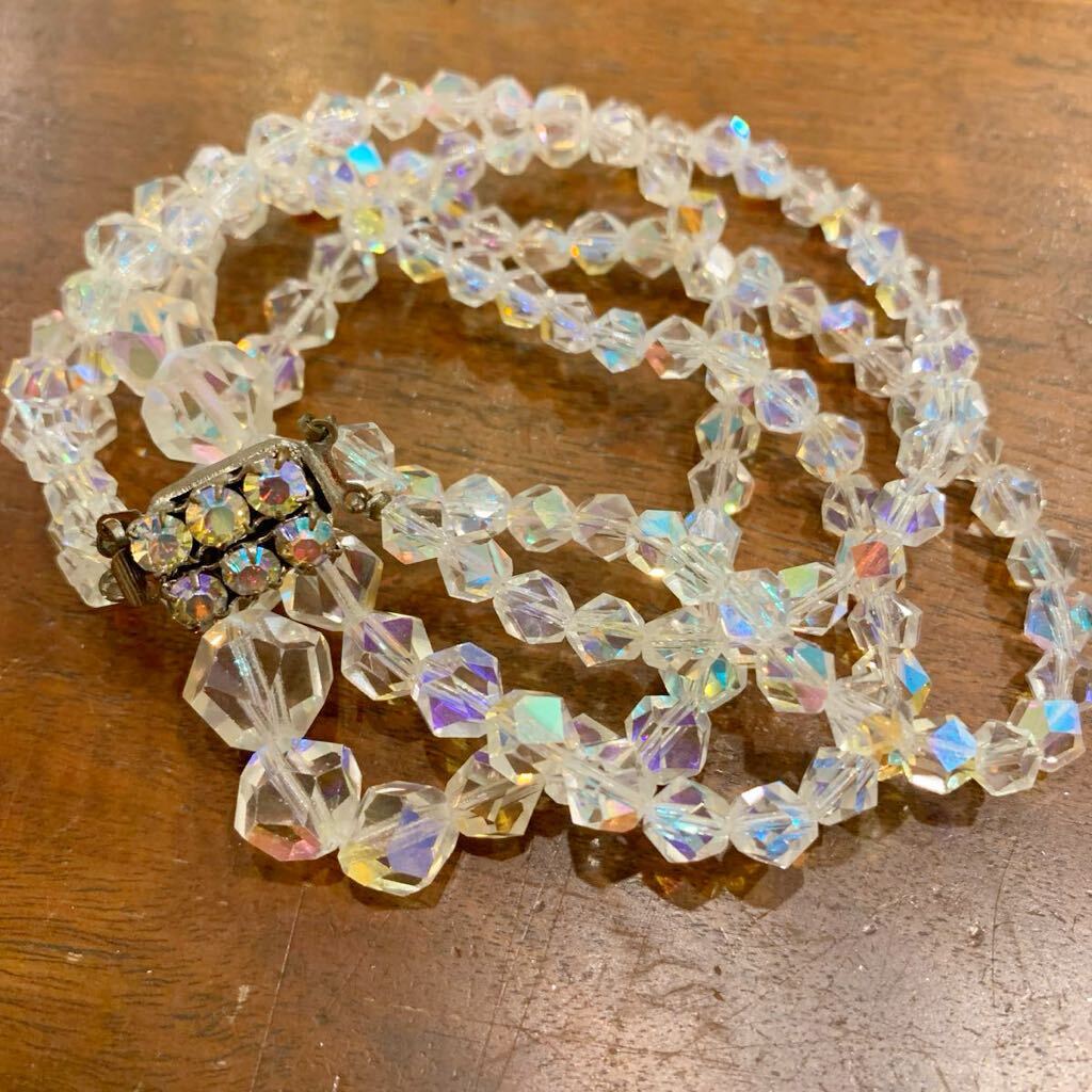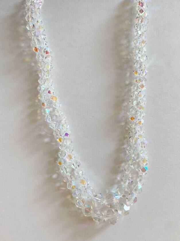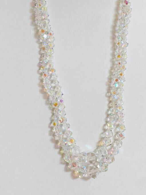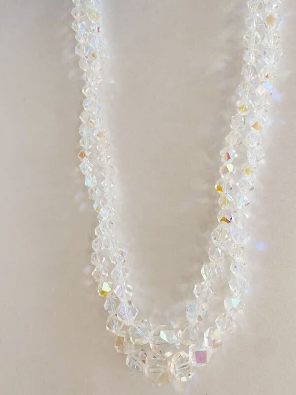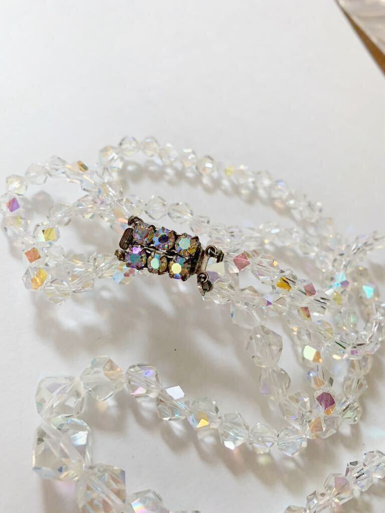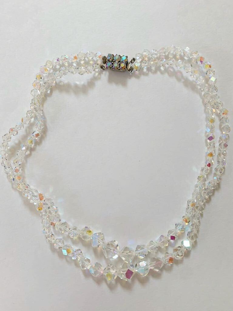 【USED】希少 イギリス購入 ヴィンテージ オーロラ クリスタルガラス 2連ネックレス16面カットビーズ レア スクエアビジュークラスプ