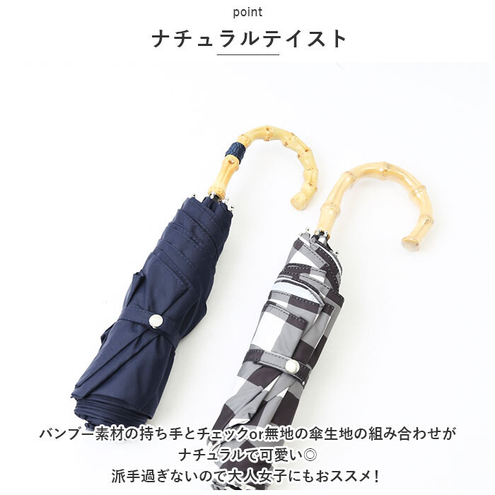 商品説明 | ・・ナチュラルな見た目が可愛い晴雨兼用折りたたみ傘が発売♪(親骨50cm) ・【ナチュラルテイスト】 ・バンブー素材の持ち手とチェックor無地の傘生地の組み合わせがナチュラルで可愛い◎ ・派手過ぎないので大人女子にもおススメ! ・【晴雨兼用】 ・UVカット率約80%で夏の厳しい日差しもカットしお肌に優しい!オールシーズン、雨の日も晴れの日も使えるアイテム♪ ・【スムーズな手開きタイプ】 ・手開きに加え、安全カバー付きで指を挟まず安全に開閉可能♪ ・【ハンドル】 ・デザイン性だけでなく、竹の節目の凹凸が手になじみやすく持ちやすいのもポイント。 ・プレーンカラータイプにはアクセントに傘と同色のタッセル付き。 ・【留めバンド】 ・パチッとしっかり留められるスナップボタン式。 ・【収納袋】 ・折りたたみ傘と同柄デザインの収納袋付き。 ・持ち手も付いており手持ちやフック等にかけての持ち運びもOK! |
