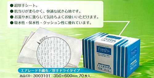 「フレッシュプラス ディスポタオル エアレード不織布 厚手ドライタイプ」▼4975139011387▼(商品説明)・ 195×185×315mm ・・PackageQuantity:1・商品サイズ (幅×奥行×高さ) :幅315mm×奥行185mm×高さ195mm(パッケージサイズ)・原産国:中国・内容量:70枚入商品紹介 ●丈夫で破れにくいエアレード不織布の厚手シ-ト。 ●素早い水分吸収力と強度で気持ちの良い使い心地。 ●厚手大判サイズのドライタイプなので幅広くご使用いただけます。 ●お体の清拭タオルや入浴介護等に。 ●赤ちゃんのお尻拭きやペットのケアに。・使用上の注意 ・火のそばでのご使用はおやめください。 ・水に溶けないので、トイレや排水口に捨てないでください。 ・常に清潔さを保つために、こまめに取り替えるようにおすすめします。 ・万一、かゆみ・かぶれ等に症状があらわれた場合は、直ちにご使用をやめ、専門医にご相談ください。