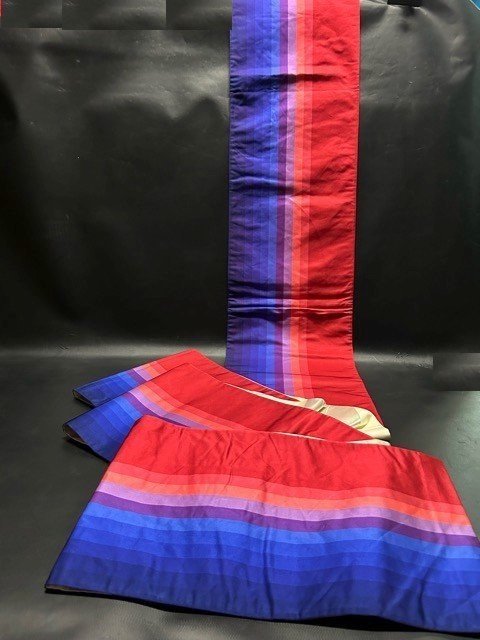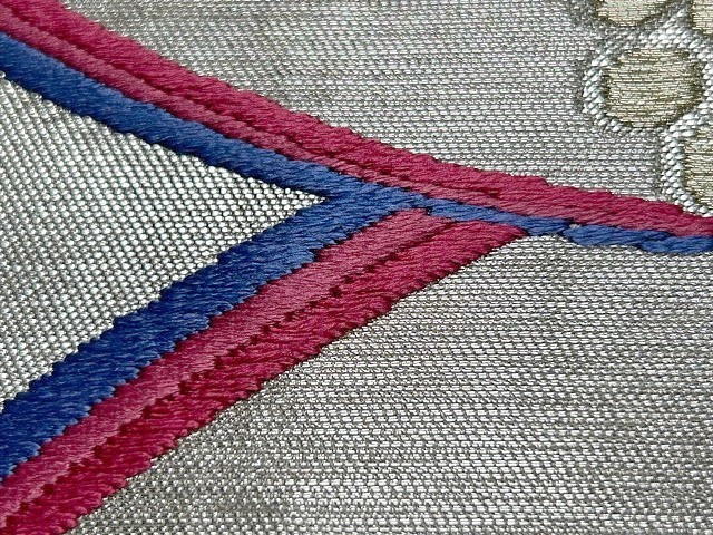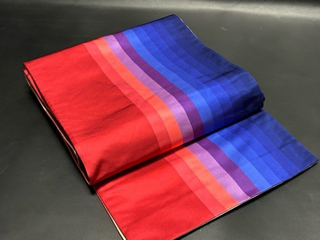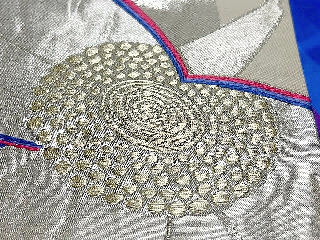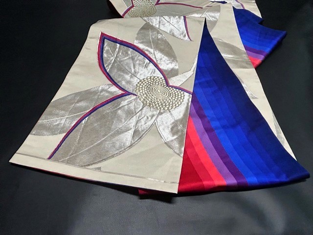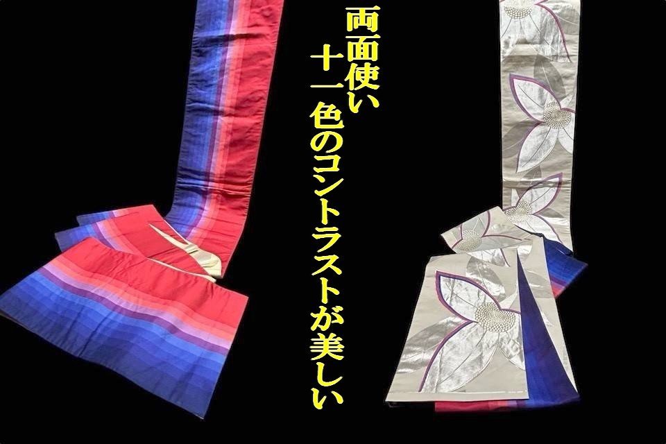 ◇十一色の色彩コントラストが印象的 両面使い帯【十一色×艶やかな銀色の大輪の華紋】高級和装リメイクにも P02134