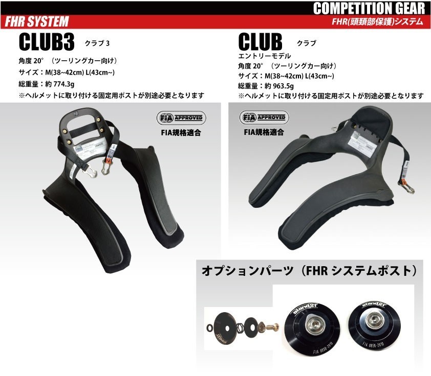 もしもの時にFHRシステムが貴方の体を守ります!![]() FHR(頭頚部保護)システムとは、救命デバイスの一つでヘルメットや耐火レーシングスーツ等と同様、レーサーの安全を最大限に保つためのシステムで、ヘルメットと首のサポーターを紐状のもの(テザー)でつなぎ、首のサポーターの部分は肩から胸まで伸びていてシートベルトで上から押さえつけることで位置を固定する。 ご購入の際には下記メーカーホームページより製品仕様をご確認ください。 メーカーホームページ