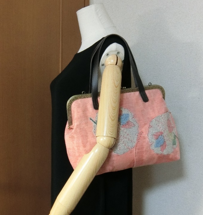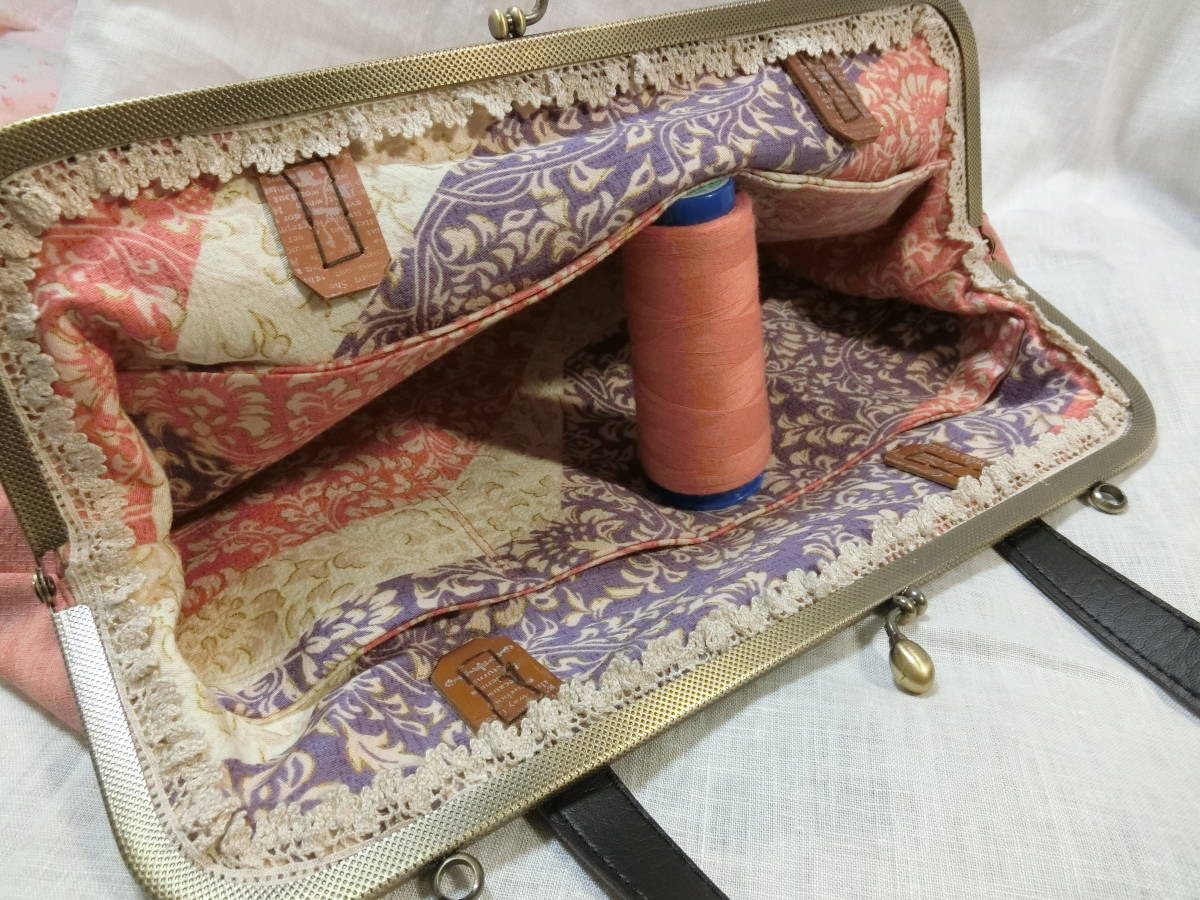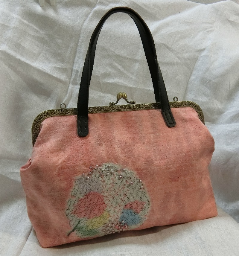 送料無料!紬の着物リメイク 大きながま口バッグ ハンドメイド オレンジピンク いつうさ【41q】