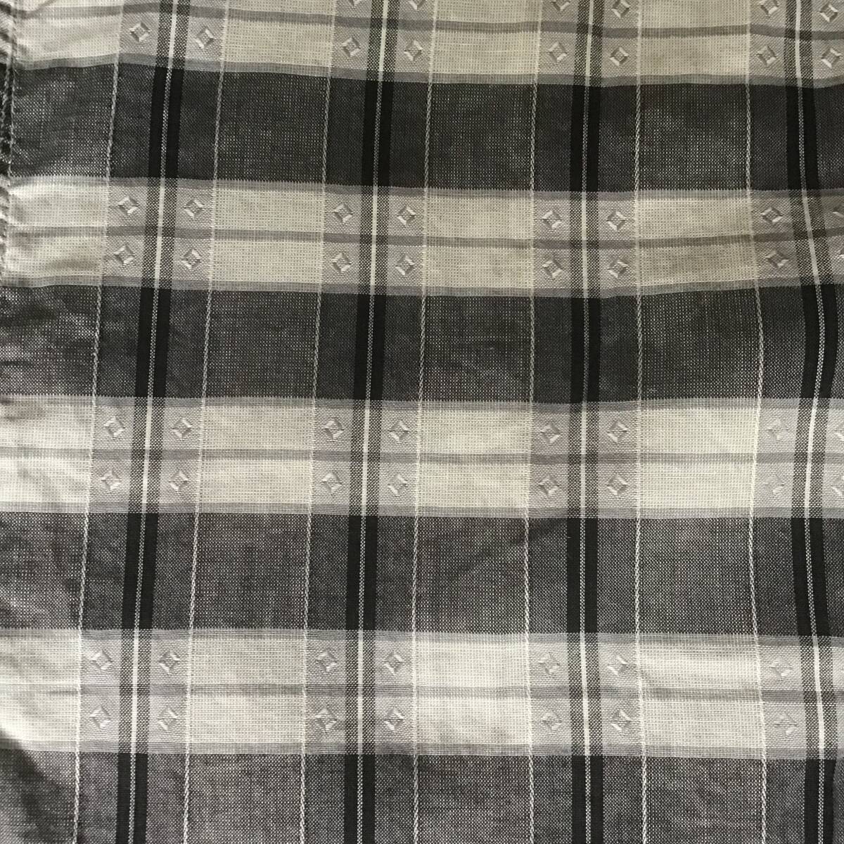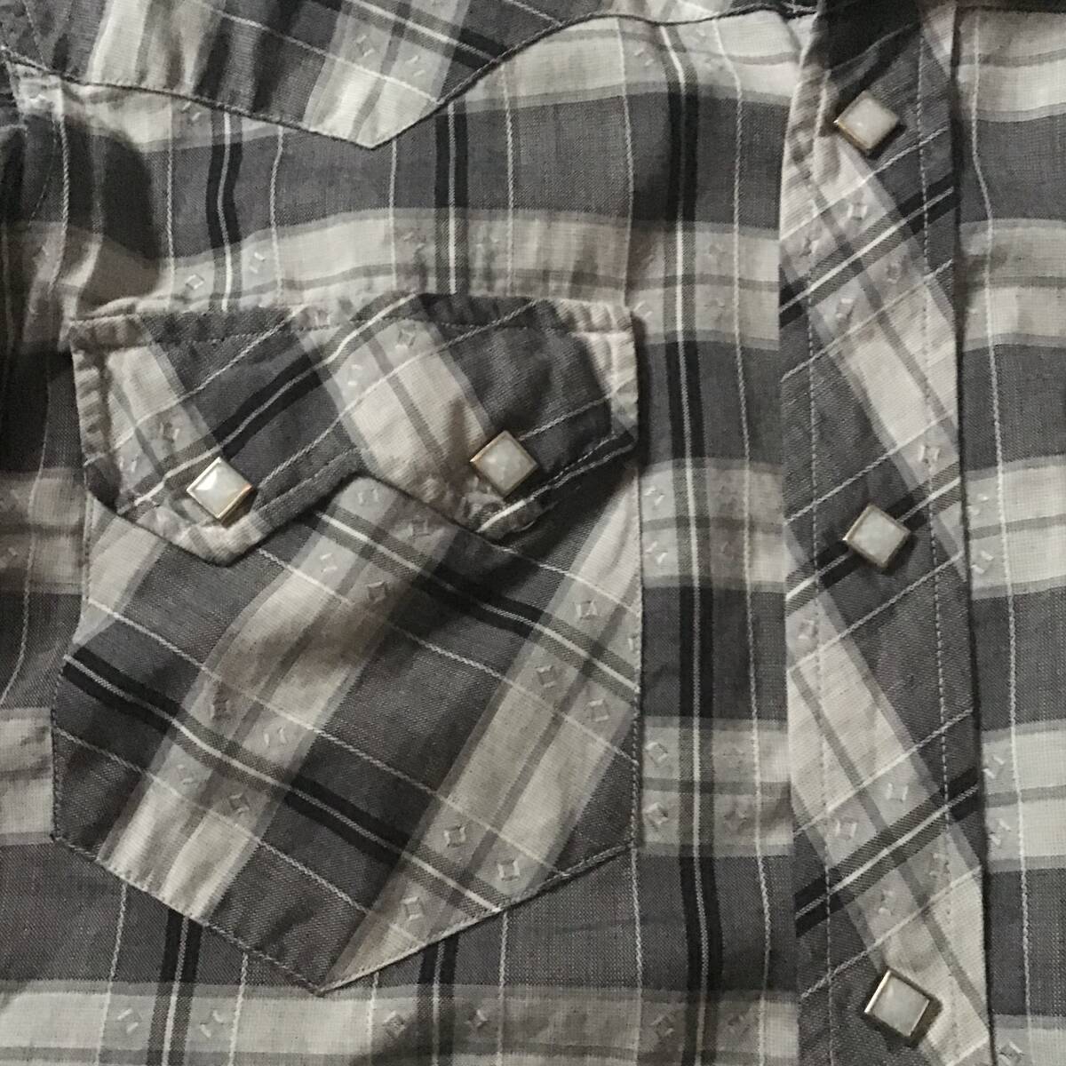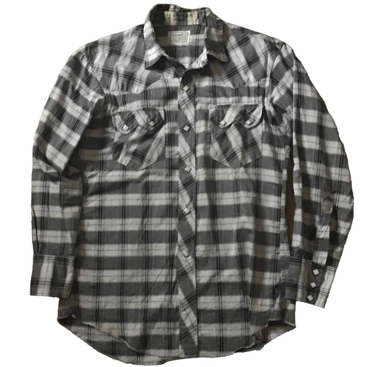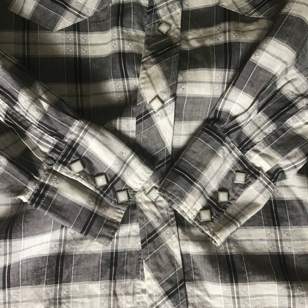 White x BLACK Shadow Dobby Plaid with Diamond Snap Western Shirt ■ 特筆ポイント 1950年代の『H bar C 』ロープタグ (MADE IN U.S.A.表記なし)が付くこのウエスタンシャツは、非常に珍しくヴィンテージ感が満載の凝った織りが特徴のWhite x Black/Grey シャドーのオンブレドビーで希少価値の高い固体になります。 ヴィンテージ・ドビー織機を使い凹凸のある菱形ドビー模様とドビーストラップが綿密に織り込まれたとてもクールなヴィンテージ・ファブリックとまず『H bar C 』では見ることのないソートゥース (Sawtooth)と言うノコギリ歯型形状ポケットとダイアモンドスナップが用いられたデザインはとても希少です。 ヴィンテージ・ブランドとして人気がある『H bar C 』ですが、1950年代までのアイテムは益々少なくなってきています。たとえ見つかったとしても、99%がクラシックな丸いスナップと三角形のフラップポケットが付いている固体か、レーヨン素材でスマイル型ポケットです。オンブレドビーファブリックとソートゥースのポケットデザインを用いたシャツはまず出てこないでしょう。またカジュアル好きには非常に気になる襟芯は入っていません。 ウエスタンシャツのスナップとフラップポケットは 、1946 年に『ROCKMOUNT RANCHWEAR』の創設した『Papa・Jack (パパジ ャック)』こと Jack A. Weil (ジャック アーノルド ワイル)によって考案されたものです。 50’s LEVI‘S サドルマンやショートホーンでも用いられたデザインですが、ヴィンテージのウエスタン・シャツに精通している方なご存知の特徴的なソートゥースのポケットデザインは『ROCKMOUNT RANCHWEAR』 がオリジナルで特許が取得されています。 貴重なBLACKシャドウのオンブレドビーは、刺繍やパイピングなどの入らないシンプルなミニマルデザインでグランジ的なロックテイストもありスタイリッシュです。多様なカジュアル・コーディネートがしやすく、長いシーズンで活用が出来るものです。またダメージのない極優良のヴィンテージ・コンディションですので長く愛用出来ます。 愛着のあるシャツですが、そろそろ整理が必要な時期時なり出品を決断しましたので価値観を共有できる方にお渡し出来ればと思います。 好条件が揃った激レアな『H bar C by California Ranchwear』ですので、ご興味がある方は、是非、この機会にご検討ください。 ■ コンディション ・個人所有 / 自宅保存 ・問題個所の無い極優良コンディションです。 ■ サイズ ・表記 : 欠損していますが、ネックサイズ 15-1/2 で間違いなく Medium になります。 ■ 採寸 (素人採寸・平置きになりますので多少の誤差は御了承下さい) ・身幅 : 約 51 cm ・着丈 : 約 73 cm ・袖丈 : 約 56 cm ・肩幅 : 約 45 cm ・裄丈 : 約 79 cm Terms and Policies (取引規約およびポリシー)