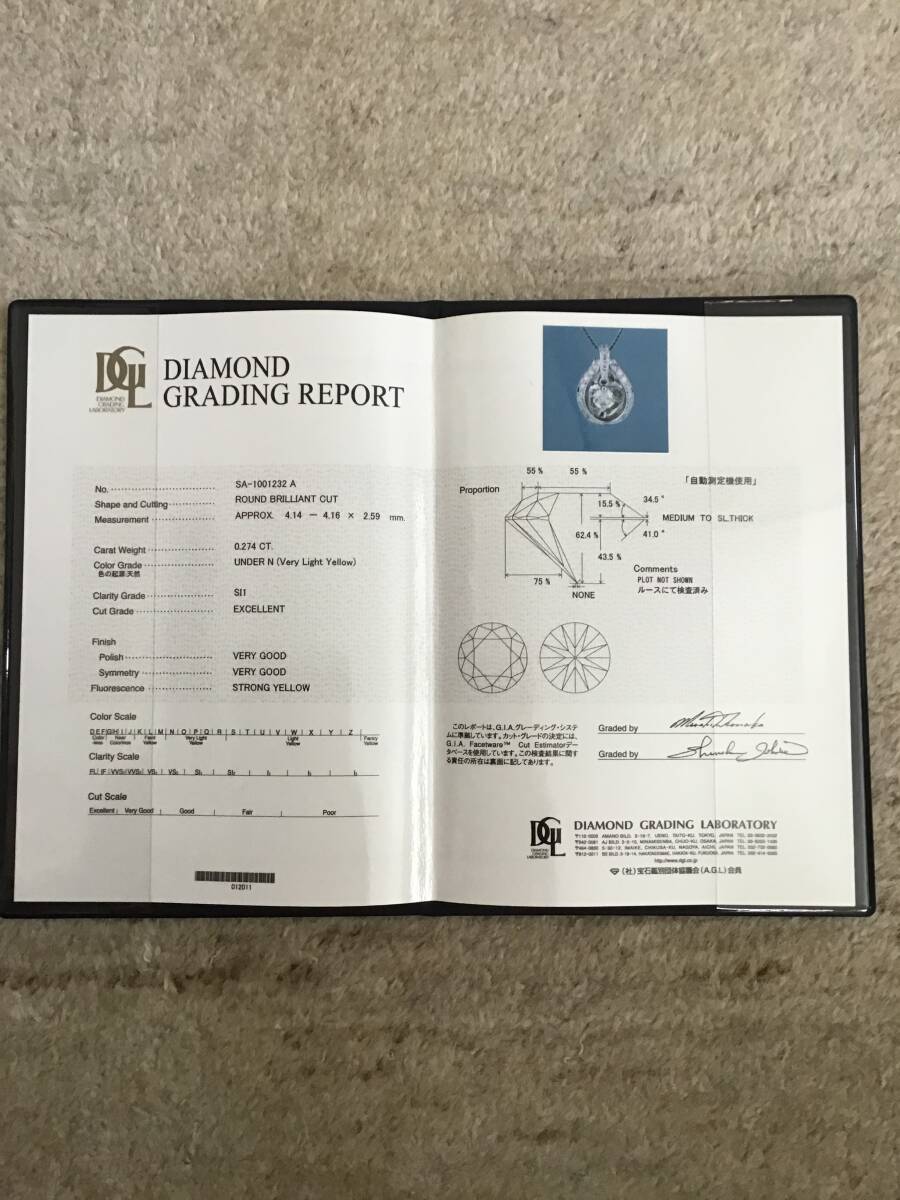 高品質 鑑定書付 ダイアモンド ネックレス トップ k18 W.G. Excellent SI1 Very light yellow レーザーホール (^^)