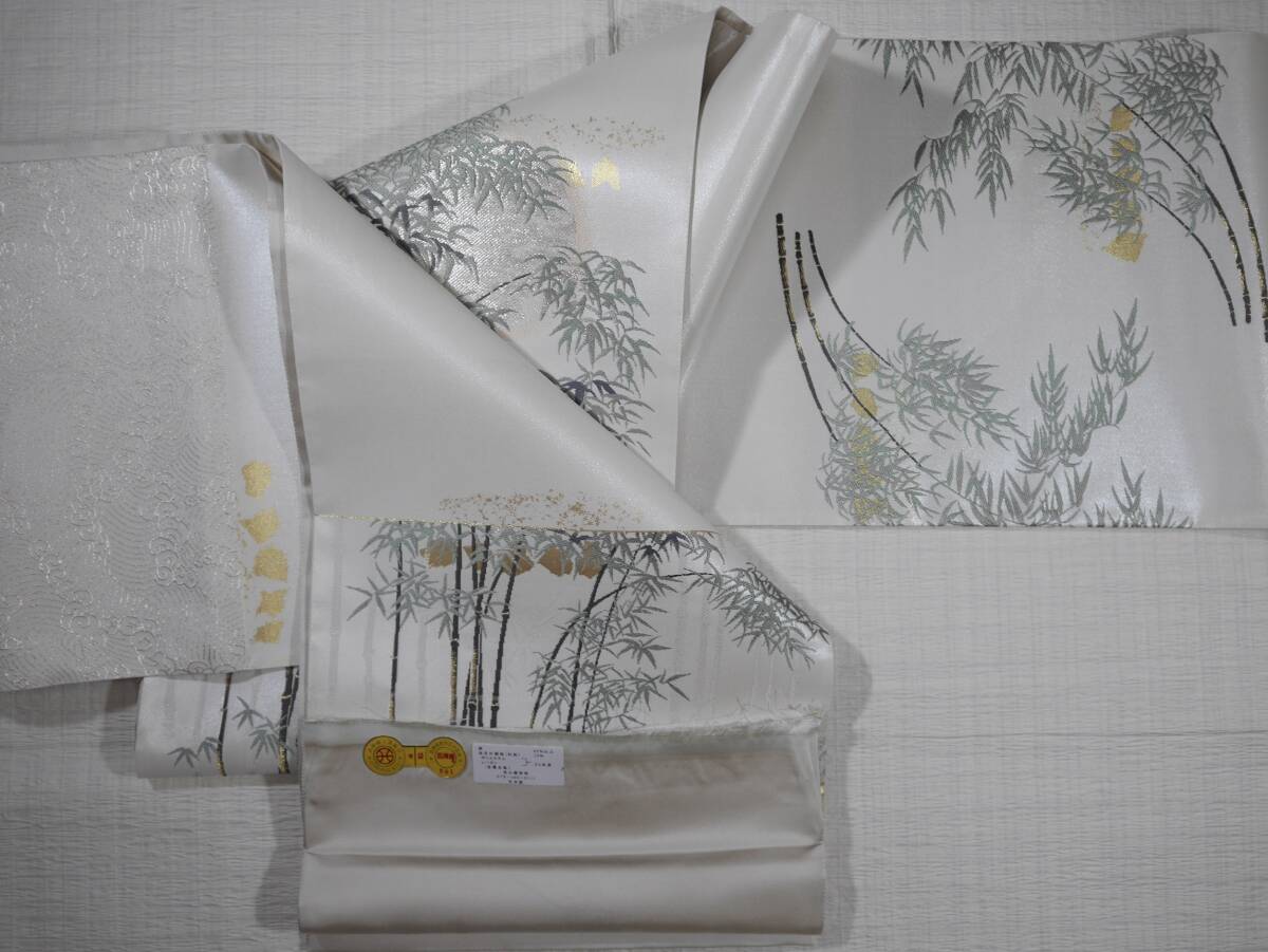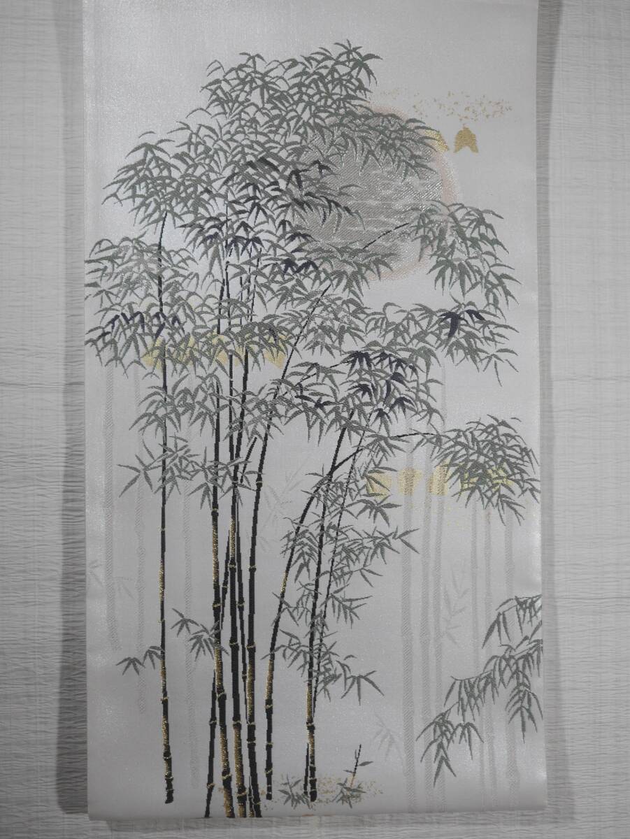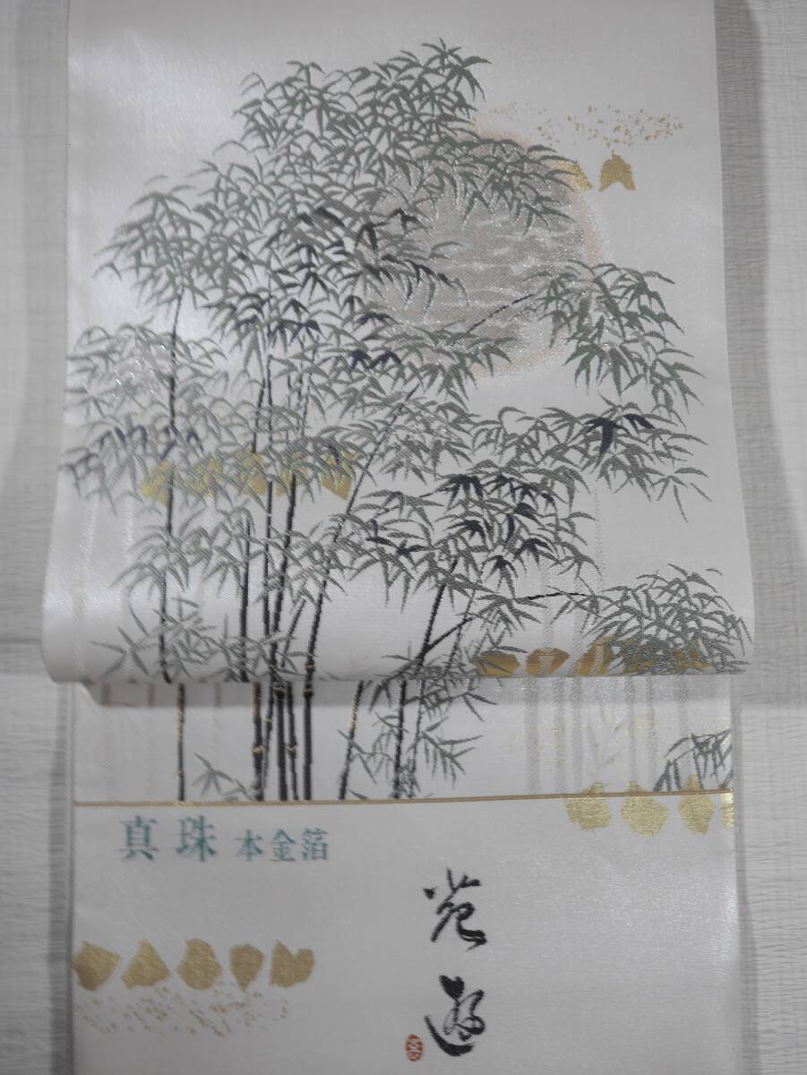 西陣織の老舗浅山織物より織りあがったばかりの袋帯です。キラキラと光り輝く真珠箔の白の帯地に銀月夜をバックに爽快な竹林がシルエットと共に風に揺られています。粋なお着物、お洒落なお着物の柄合わせにいかがでしょうか。お仕立てには三河の綿芯を入れ手縫い仕立てを致します。お仕立て上がりには3~5日のご猶予お願い致します。