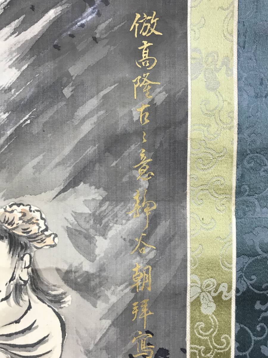 【作品状態】 本紙は絹本肉筆です。本紙は薄汚れ、全体に汚れシミ、多少の巻シワあります。表装は多少の巻シワあります。巻裏に多数の汚れシミ、虫ナメあります。