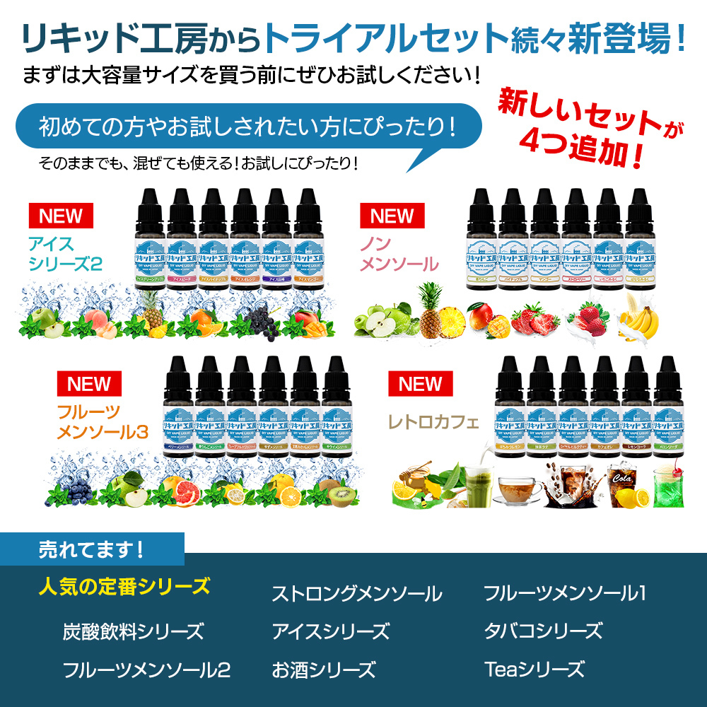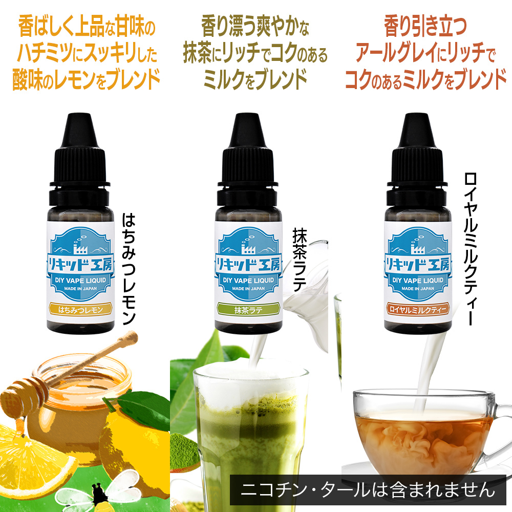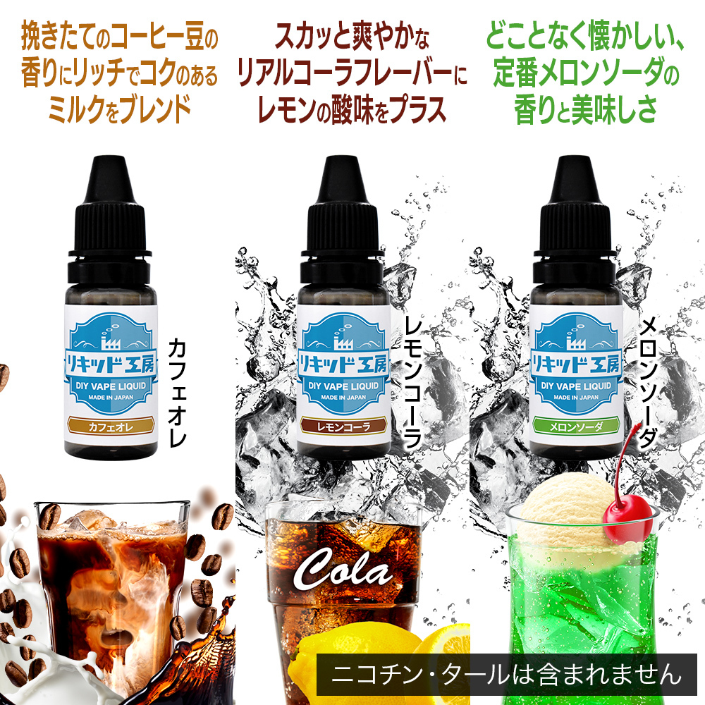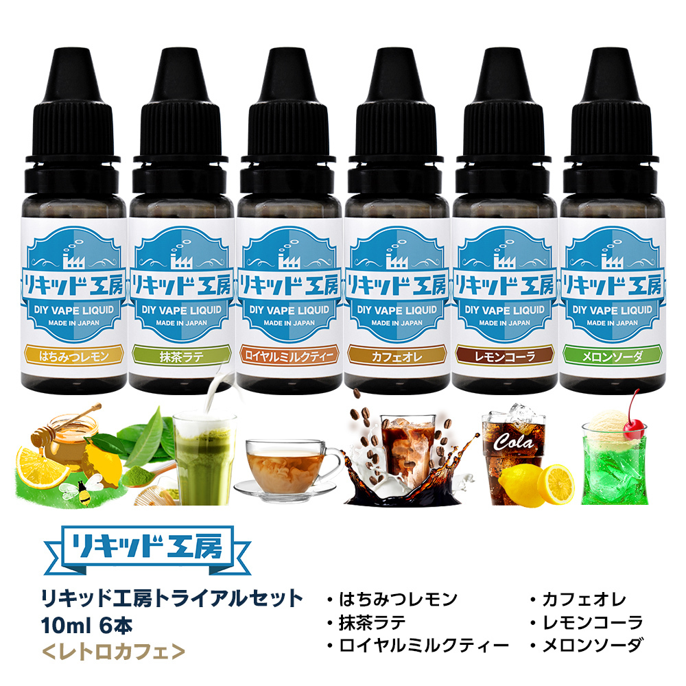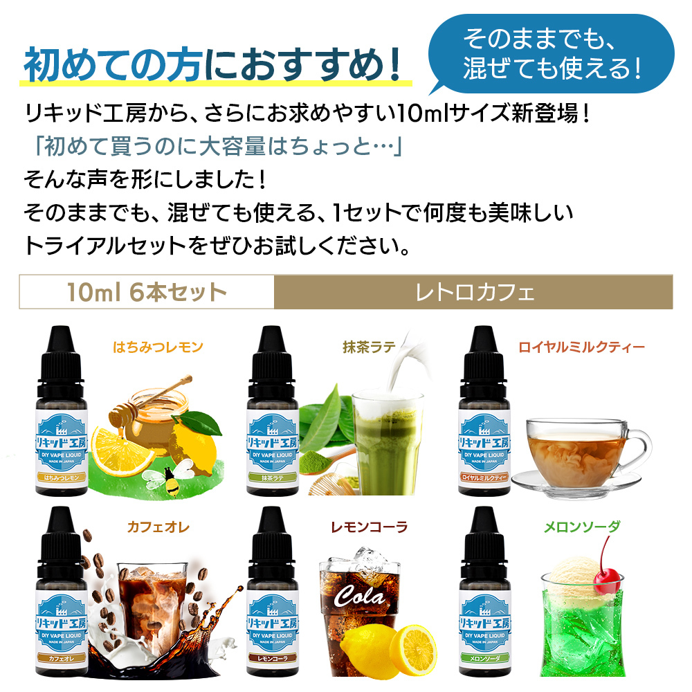 【リキッド工房から10mlシリーズ新登場】みなさまからの【気になるフレーバーを少量サイズのリキッドで試したい】という声から商品化しました。全90種類のフレーバーから人気のはちみつレモン、抹茶ラテ、ロイヤルミルクティー、カフェオレ、レモンコーラ、メロンソーダの6種類をお試しセットで販売。【安心安全な日本国産】最高品質の天然素材を使用し厚生労働大臣指定の食品添加物のみ100%配合。<セット内容>リキッド工房 人気フレーバー 10ml×6本(はちみつレモン 抹茶ラテ ロイヤルミルクティー カフェオレ レモンコーラ メロンソーダ)<商品仕様>■ボトルサイズ:10ml■ボトルタイプ:プラスチックボトル■成分:食品用グリセロール純度99.7% 食品用プロピレングリコール99% 食品用香料 ■混合比率:VG50%PG50%■香料:ニコチン・タール・有害物質:なし■日本食品分析センター検査済み:発がん性物質検出されず