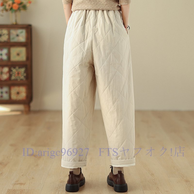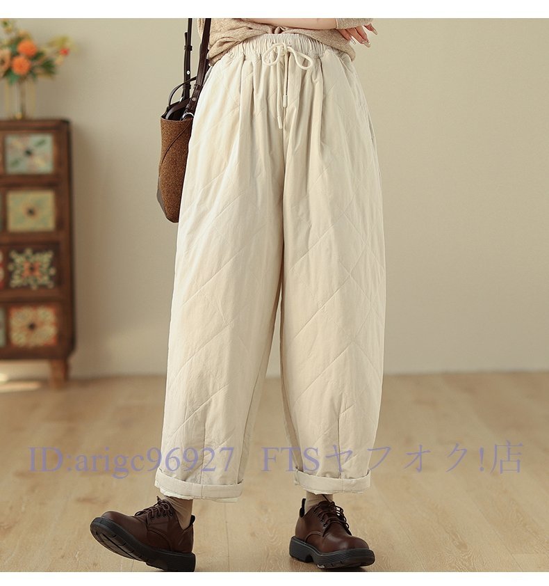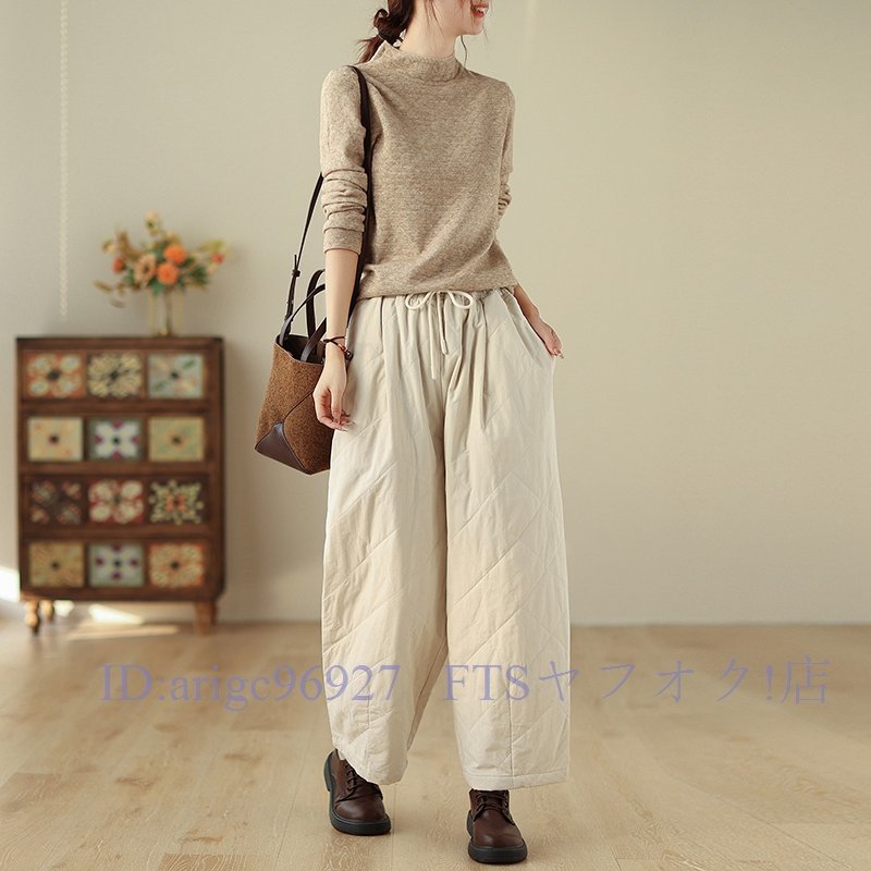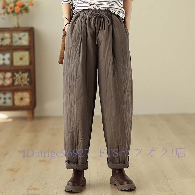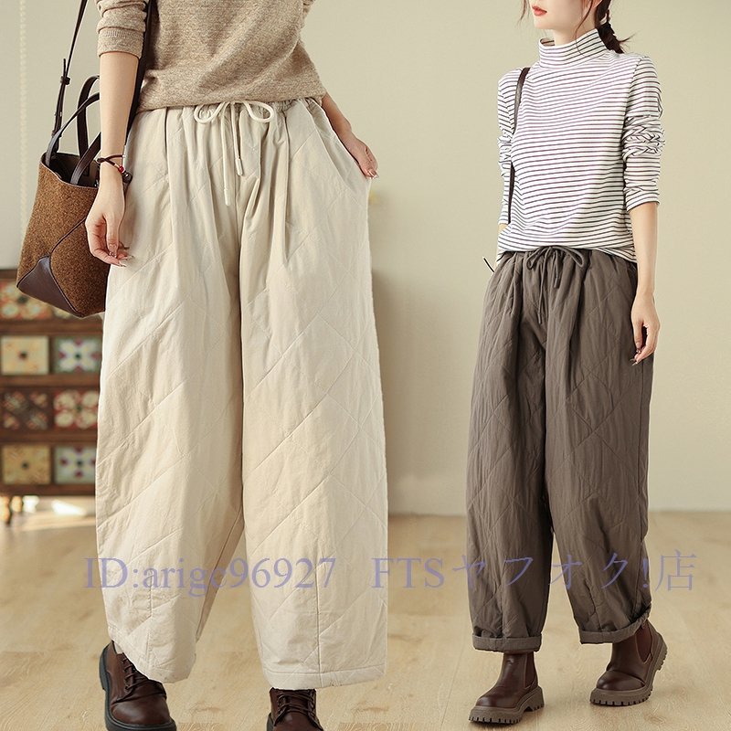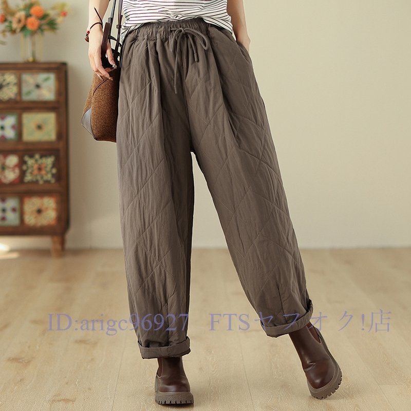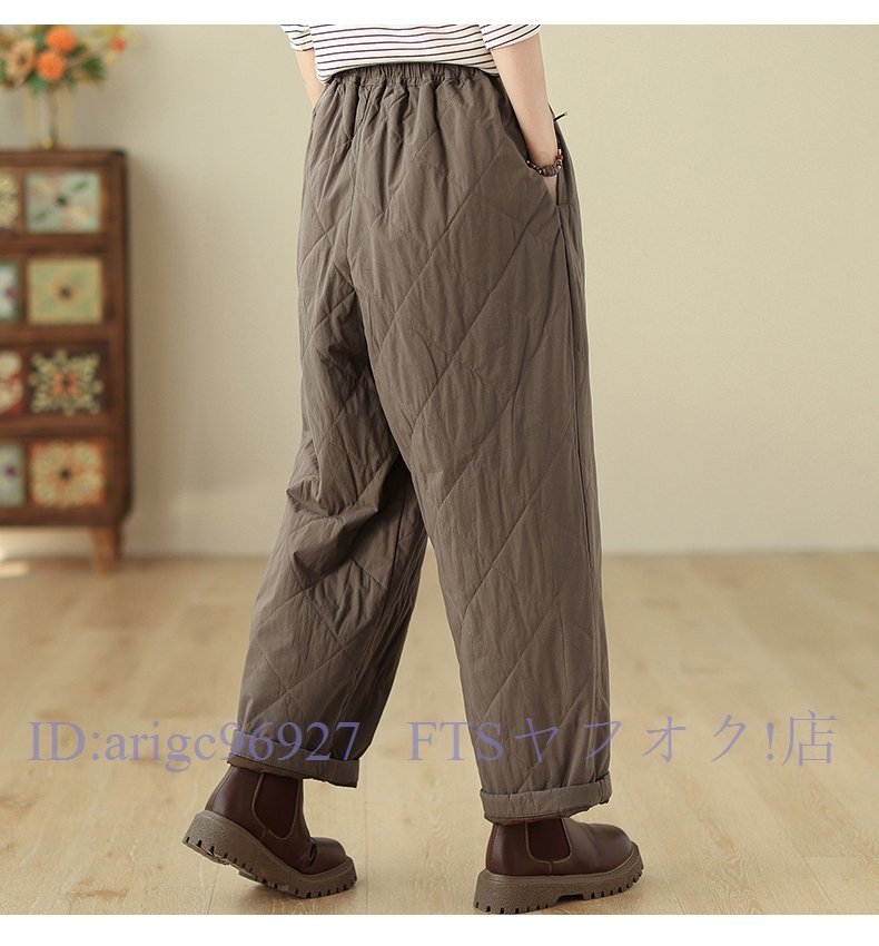 A6435☆新品秋冬 オシャレ ゆったり大きいサイズ 暖かい 厚地中綿切り替 ひし形チェック柄 ワイドパンツ M~2XL コーヒー