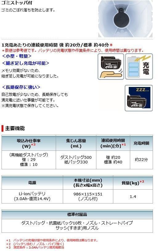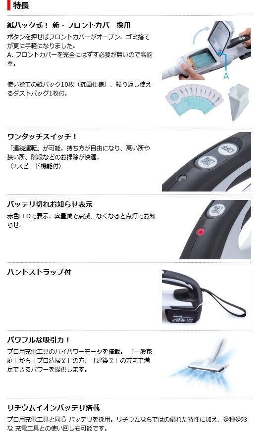 【商品説明】 マキタ 充電式 クリーナ 14.4V CL142FDZW 本体のみ新品になります。 特長 紙パック式! 新・フロントカバー採用 ボタンを押せばフロントカバーがオープン。ゴミ捨てが更に手軽になりました。 A. フロントカバーを完全にはずす必要が無いので高能率。 使い捨ての紙パック10枚(抗菌仕様)、繰り返し使えるダストバッグ1枚付。 ワンタッチスイッチ! 「連続運転」が可能。持ち方が自由になり、高い所や狭い所、階段などのお掃除が快適。 〈2スピード機能付〉 バッテリ切れお知らせ表示 赤色LEDで表示。容量減で点滅、なくなると点灯でお知らせ。 ハンドストラップ付 パワフルな吸引力! プロ用充電工具のハイパワーモータを搭載。 「一般家庭」から「プロ清掃業」の方、「建築業」の方まで満足できるパワーを提供します。 リチウムイオンバッテリ搭載 プロ用充電工具と同じ バッテリを採用。リチウムならではの優れた特性に加え、多種多彩な 充電工具との使い回しも可能です。 奥の奥までしっかり届くT型ノズル。 床面に密着して浮かないからソファーや棚の下もラクラクお掃除ができます。 斜めカットの吸込口 パイプが抜けにくく、グラグラしない。 T型ノズルなしでも掃除がしやすい形状です。 ゴミストッパ付 ゴミのこぼれ落ちを防止します。 1充電あたりの連続使用時間 強 約20分/標準 約40分* *数値は参考値です。バッテリの充電状態や作業条件により、使用時間は異なります。 <小型・軽量> <継ぎ足し充電が可能> メモリ効果がないため、 継ぎ足し充電が可能になりました。 <長期保存に強い> 自己放電が少ないため、長期保存しても 満充電に近い仕事量が可能です。 ※満充電状態で保存してください。 ※本品にはバッテリー、充電器等は付属しておりませんご注意ください。 在庫状況が常時変動しております必ず購入前にご質問ください。 ※本商品は改良や定期的に仕様変更される場合がり実際の写真と異なる場合がございますが同型番の改良された商品は新型の商品となりますのでご了承ください。 スペック等の変更はございませんご安心してお使いください。本品は別倉庫に在庫がある為入金確認後から納期が数日かかりますご了承の上ください。 ※また製品改良のため、素材・形状など一部仕様が変更になる場合がございますが、機能・品質等使用上は問題なくご使用になれますのでご安心ください。 改良や仕様変更された商品は実際の写真と異なる場合がございますが同型番の改良された商品は新型の商品となりますのでご了承ください。 本商品のメーカーでは仕様変更及び改良はメーカーで常時行われております画像にございます工具等は付属しておりませんご注意ください。 画像は代表イメージです。 本品は新品、未使用品ですが箱等に多少の汚れ細かな傷等がある場合がございますご了承ください。 完璧な商品を求める神経質な方はご入札なされないようお願いいたします。 ノークレーム、ノーリターン、ノーキャンセルでお願いいたします。 上記の記載をご理解の上ご購入のご検討をお願い致します。 【お支払方法】 ゆうちょ銀行、 ジャパンネット銀行 楽天銀行 【発送について】 沖縄・離島は別途送料がかかりますので、お問い合わせください。 注意事項 当店での出品中の商品は店頭と他サイトとの同時販売の為在庫切れなどの場合もございます、在庫切れの場合納期がかかります入札前に必ずご質問ください。 送料と振込手数料はお客様ご負担になります入金の確認後発送とさせていただきます。送料料金に関しましては梱包手数料梱包費が含まれております。 商品説明にもございますよう、多少の汚れ等ございます。完璧な商品を求める方は、入札をお控ください。 お客様都合による返品・交換は一切受け付けておりませんので、必ず詳しい程度をご確認の上ご入札下さい。気になることがございましたらご遠慮なく質問して下さい。 発送時期によりパッケージの仕様の変更が常に行われております中身自体は同等品ですが梱包パッケージや柄が変わる場合がございますご了承ください。 撮影時の状況及びお客様のPC環境等の諸事情により実際の色目と違って見える場合がございますのでご理解のうえご入札お願い致します。 在庫切れ等の場合出来る限り早急発送を心掛けておりますが、出荷まで数日かかる場合がありますので、お急ぎのお客様は在庫等お問合せ下さい 配送に補償がついておりません補償発送をご希望の方は申し出ください。ノークレーム、ノーリターンノーキャンセルでお願い致します。 土、日曜日、祝祭日、はネット業務はお休みのため、商品の発送及びご連絡等、質問への解答 が休日あけに遅なる場合がございますがご了承ください。 管理番号マキタ 充電式 クリーナ 14.4V CL142FDZW 本体のみ |