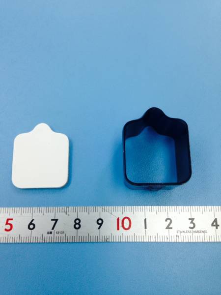 裁断用抜型 ドッグタグ11 サイズは幅が約25mm、高さが約30mmです。刃型の高さは23.6mmです。商品は、画像の抜型のみです。試し抜きで約3㎜の革を抜いてみました。
