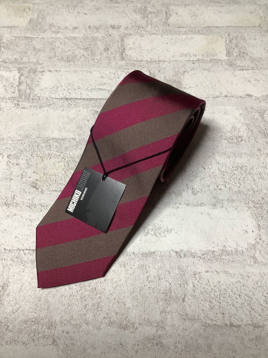 新品未使用 ミチコロンドン 日本製ネクタイ ブラウンとショッキングピンクコラボストライプ柄