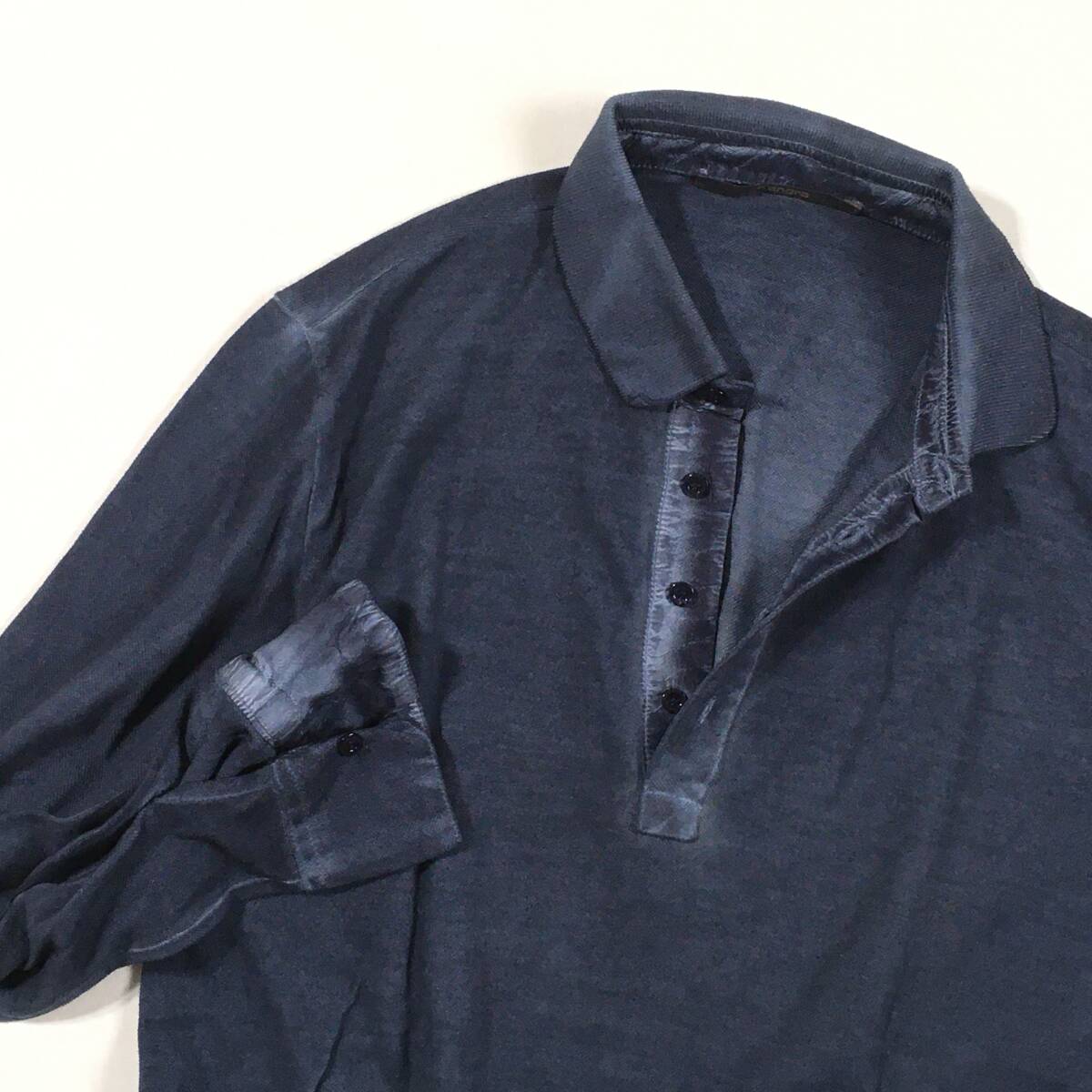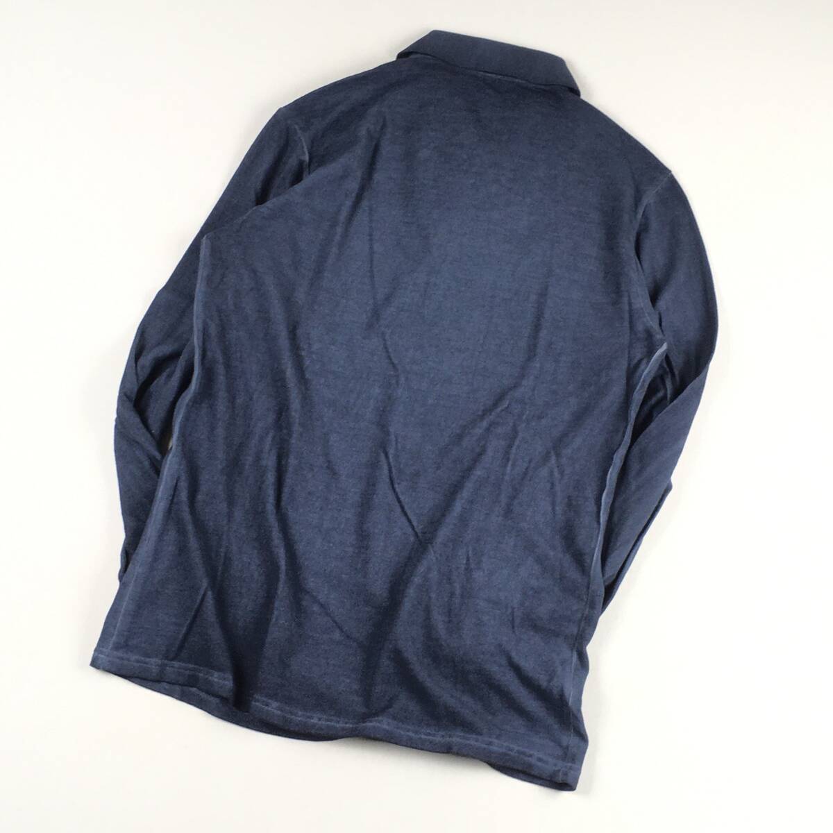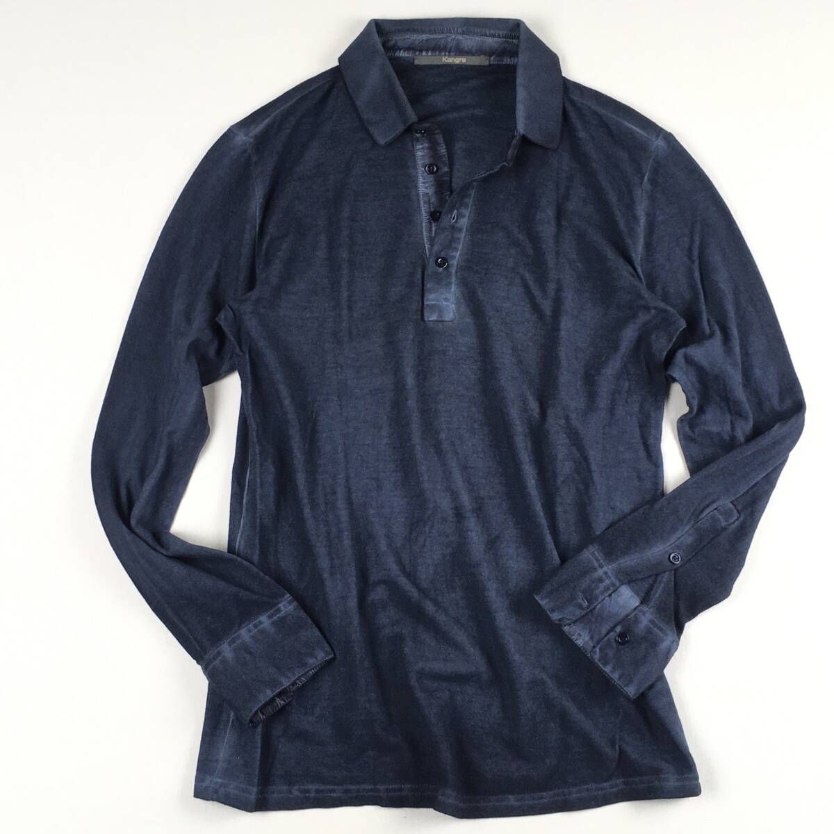 ■1点物 3.0万【Kangra/カングラ】襟元シルク仕立て/ガーメントダイ 極上・大人の長袖ポロ 46 細身/ネイビー ポロシャツ 鹿の子
