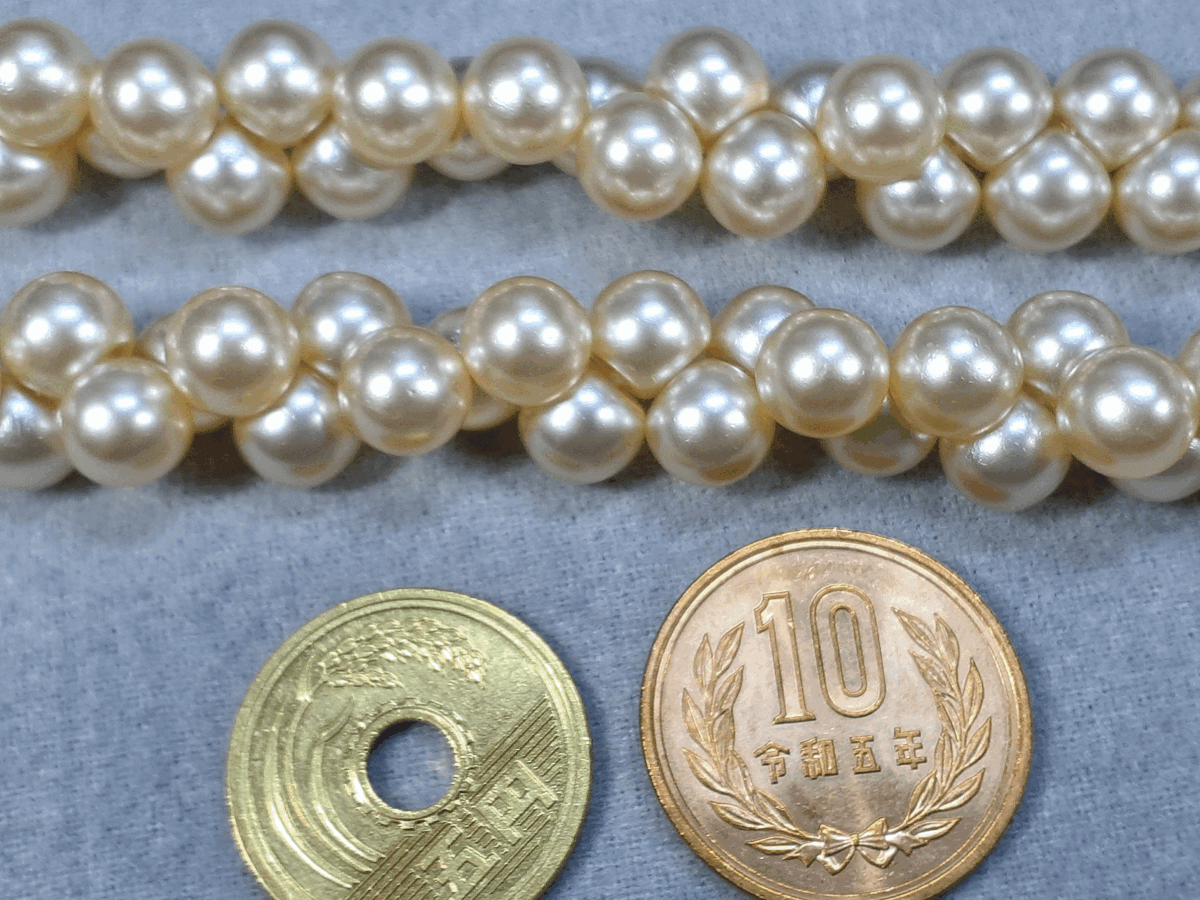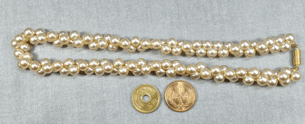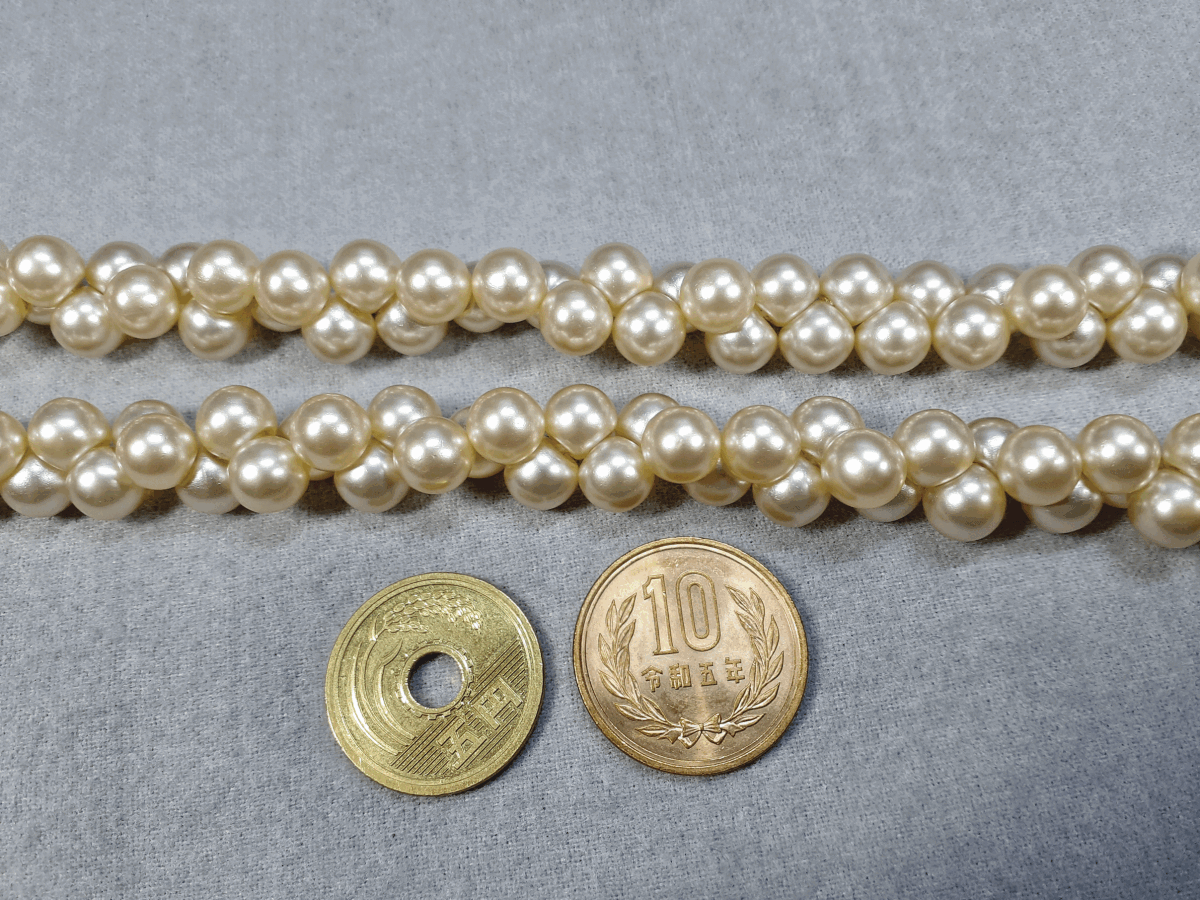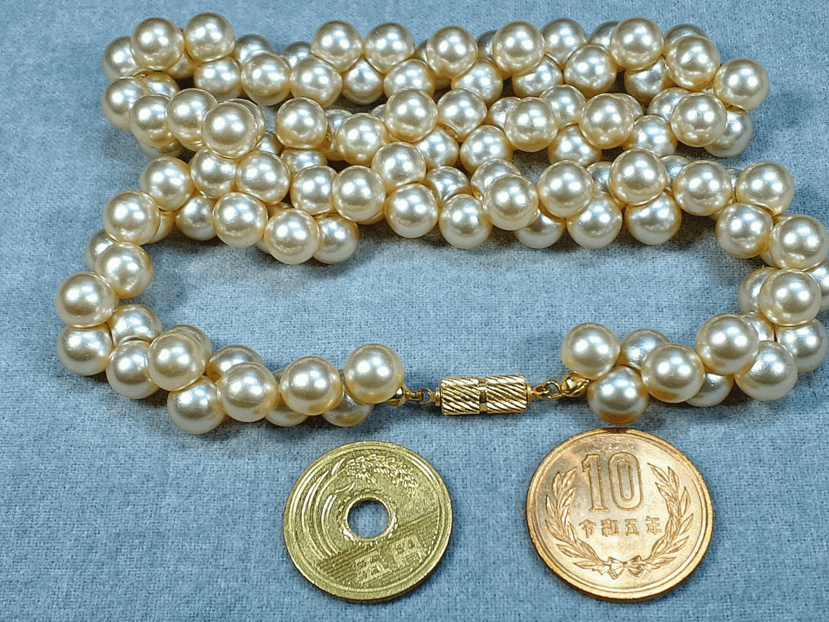 商品の ご説明 8mm アクリル玉 鈴丸ネックレス ベージュ系のパールを塗ってます。 115粒 以上使用 玉~玉 43cm 金具込みでは 46cm | ||