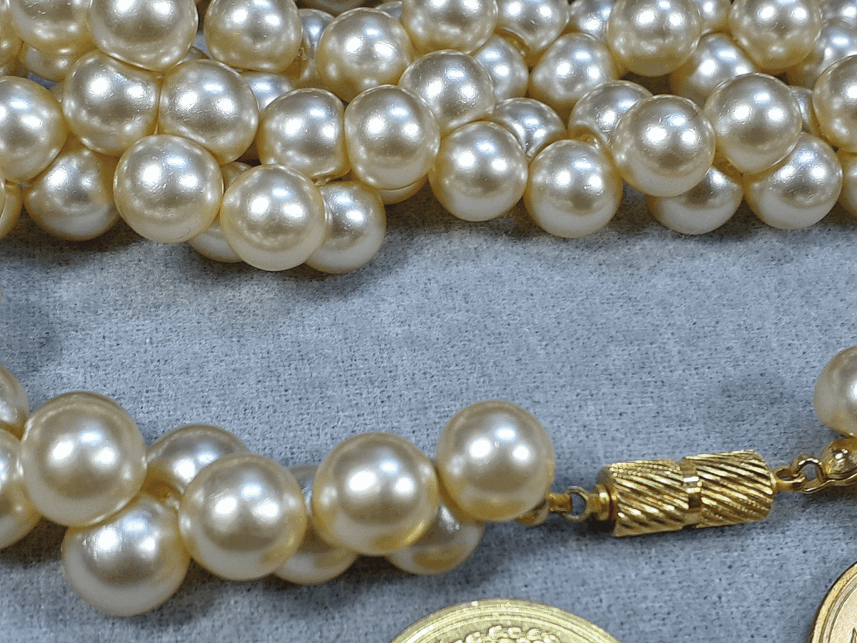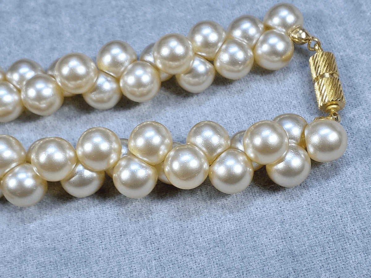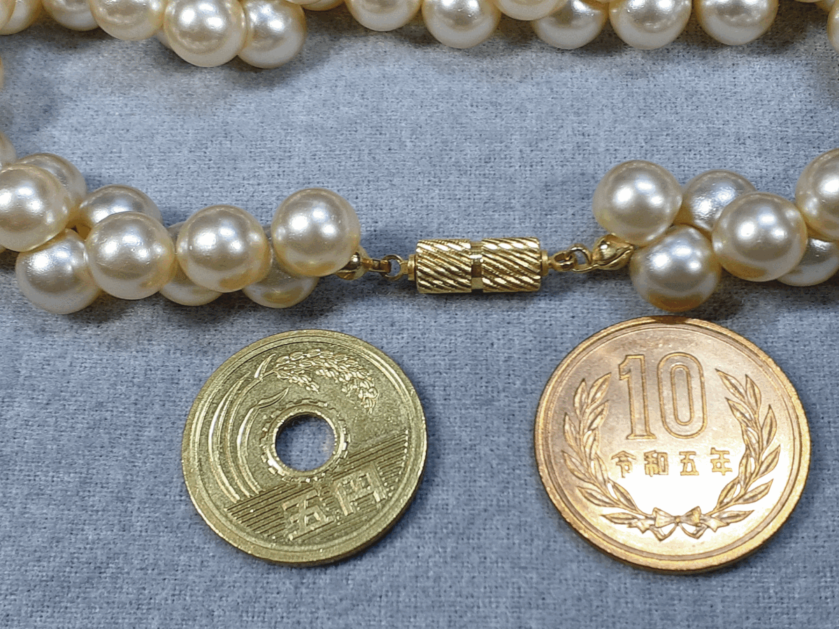 商品の ご説明 8mm アクリル玉 鈴丸ネックレス ベージュ系のパールを塗ってます。 115粒 以上使用 玉~玉 43cm 金具込みでは 46cm | ||