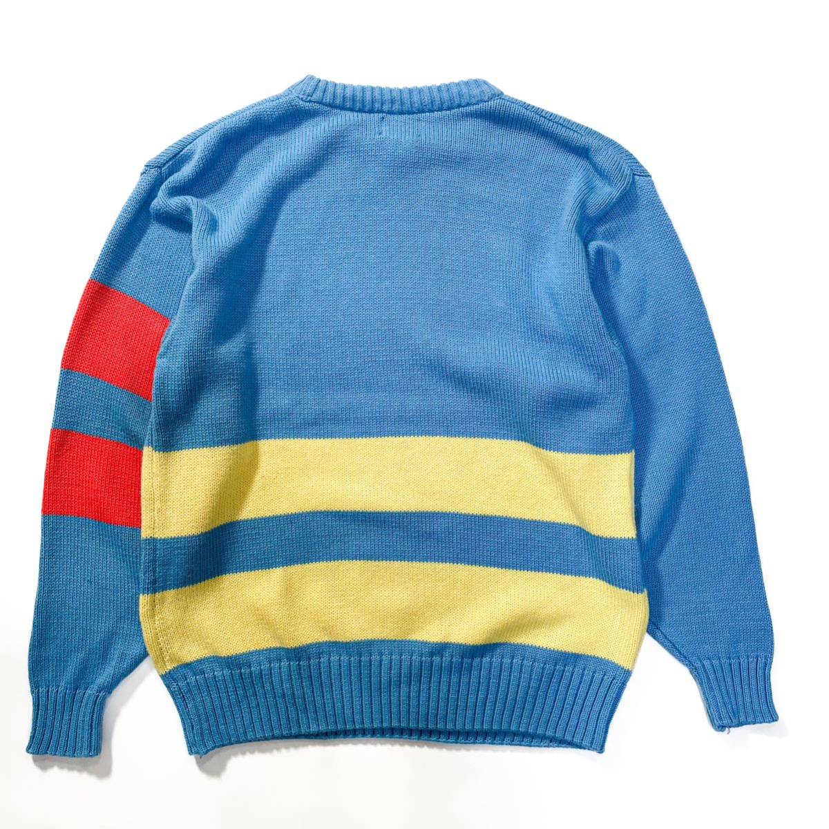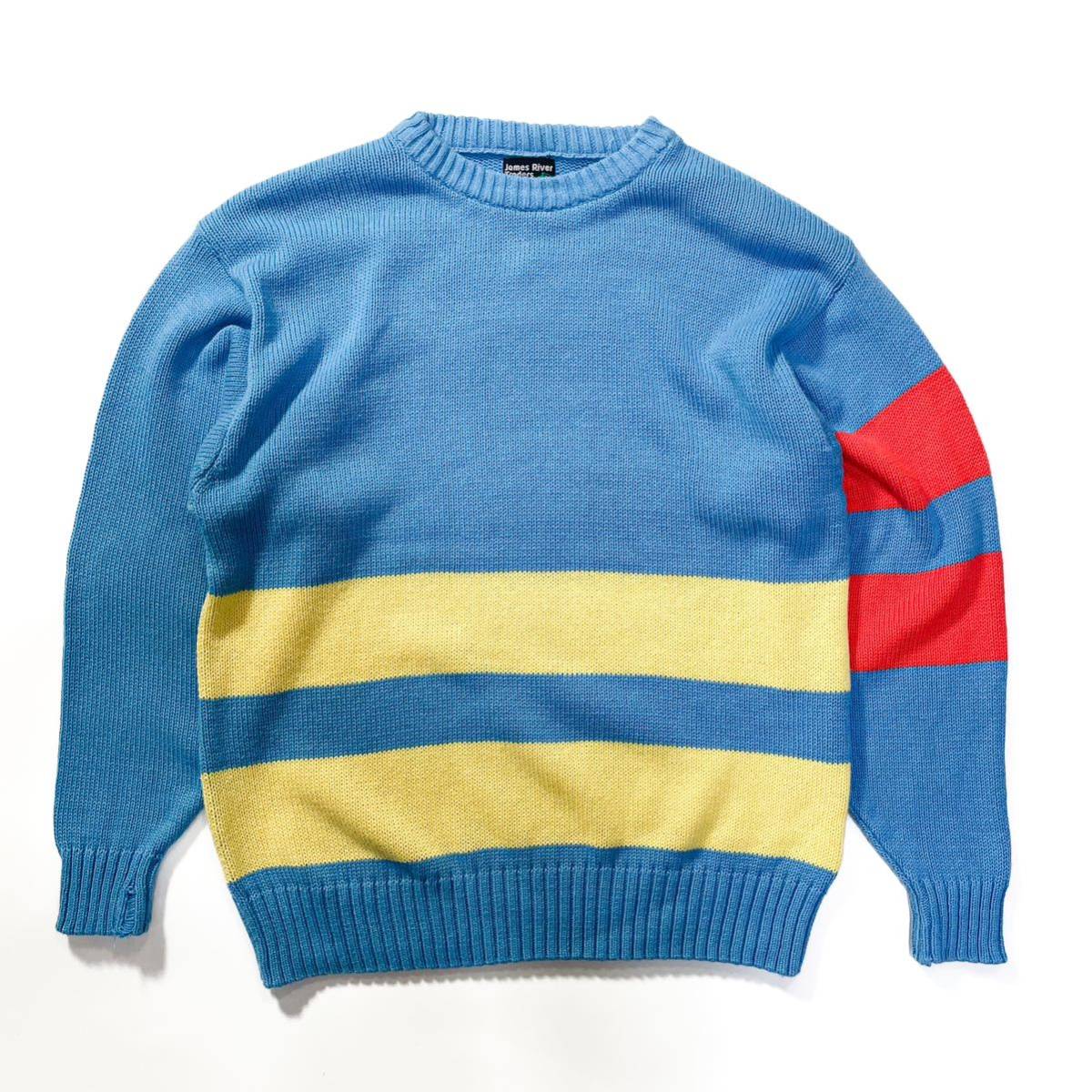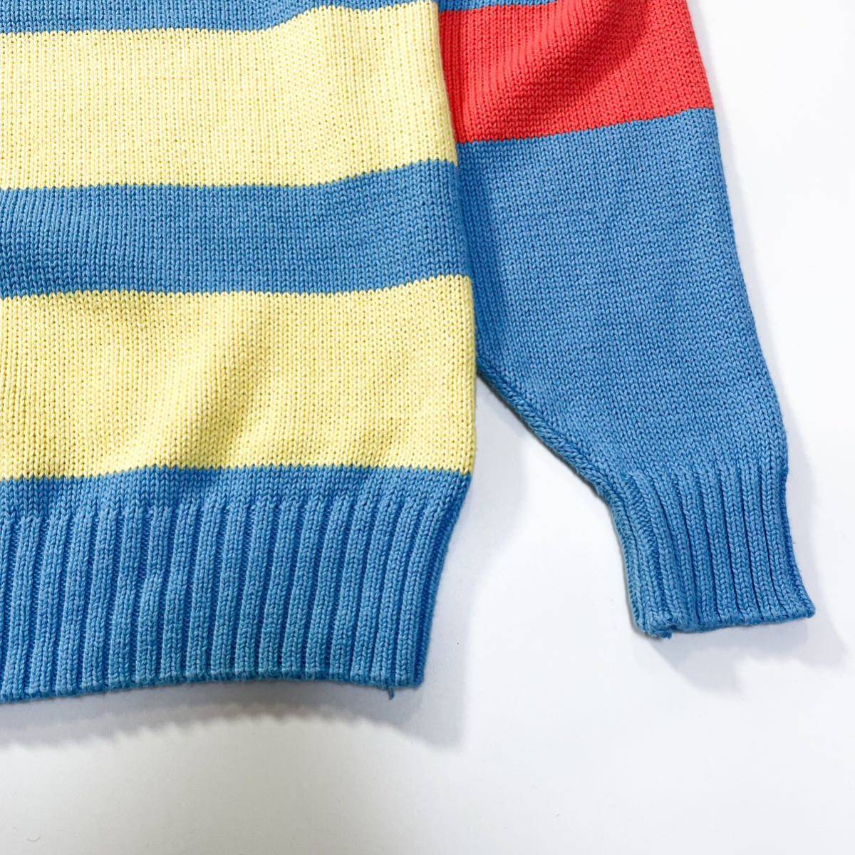 スカイブルーにレモンイエローにオレンジのライン入りニット。