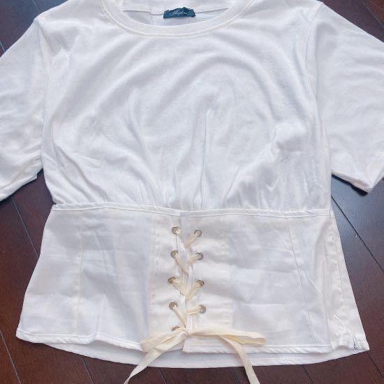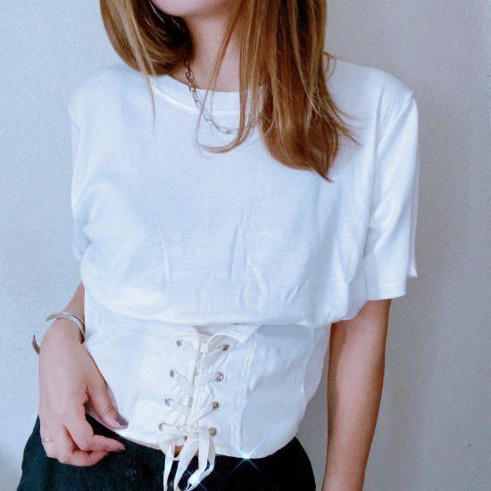 フロント部分に紐がある無地のTシャツです。