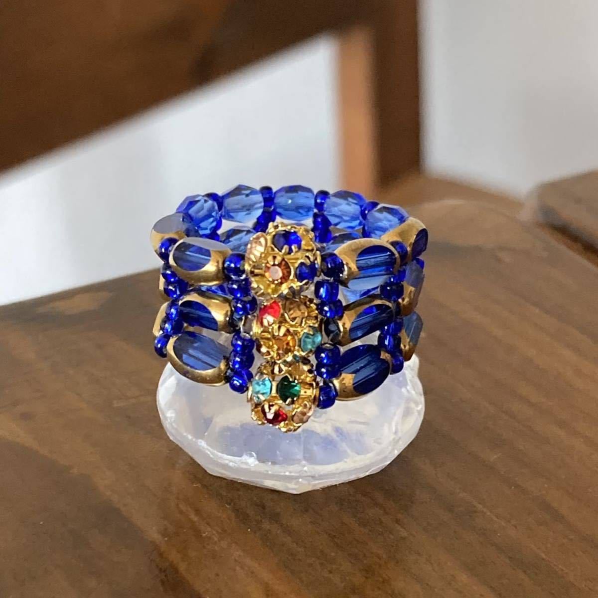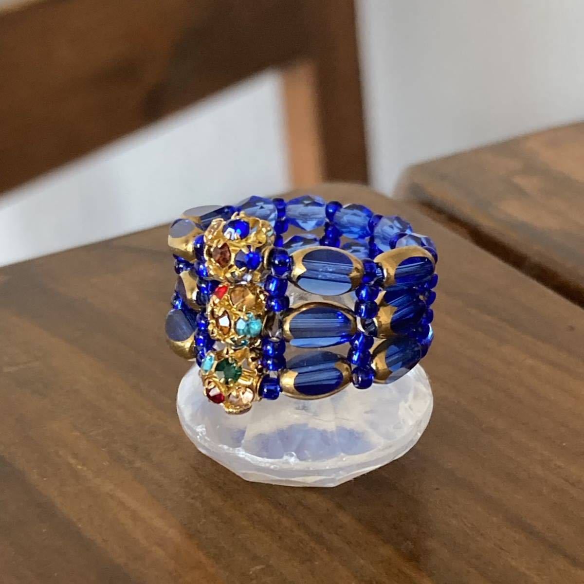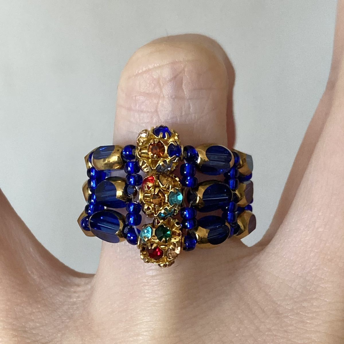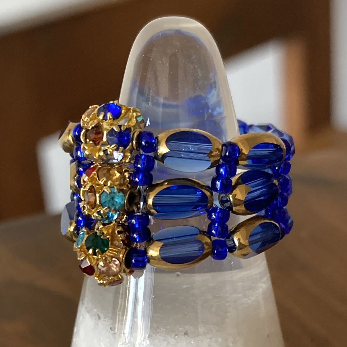 7mmのブルーのナツメガラスビーズ、中心は6mmのゴールドにカラフルなラインストーンの丸ロンデル3個、4mmのブルーのチェコビーズ、ブルーの丸小ビーズで作ったリングです。