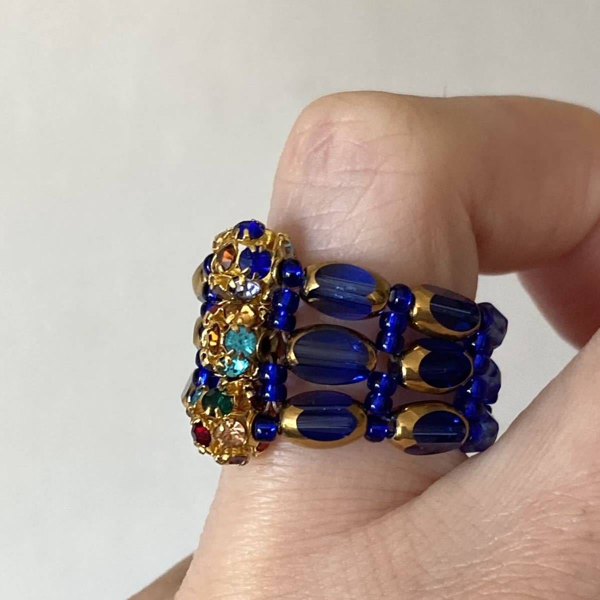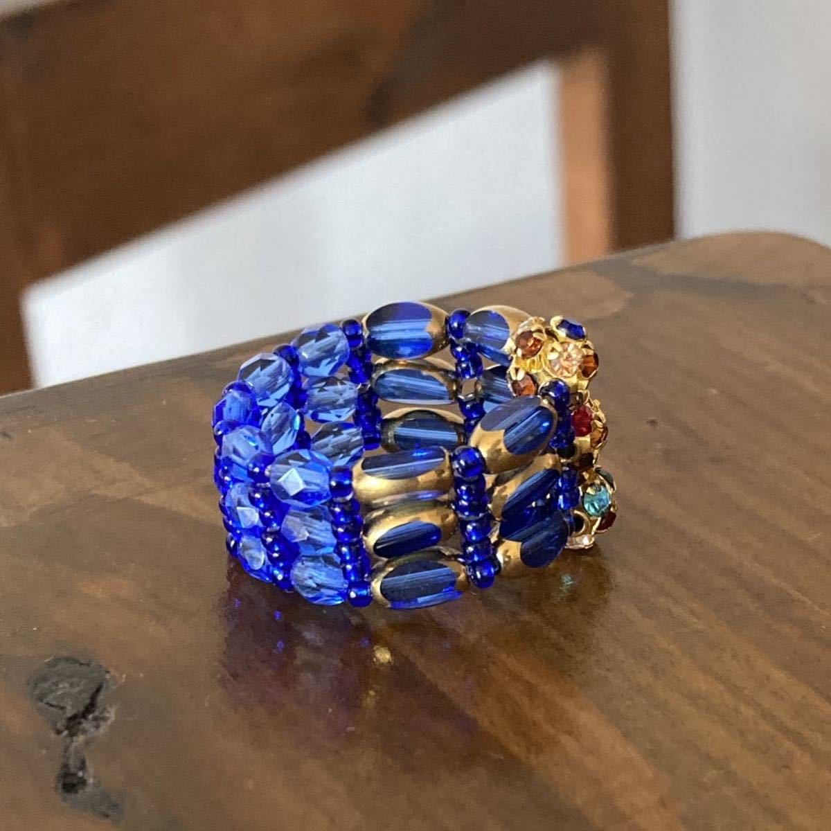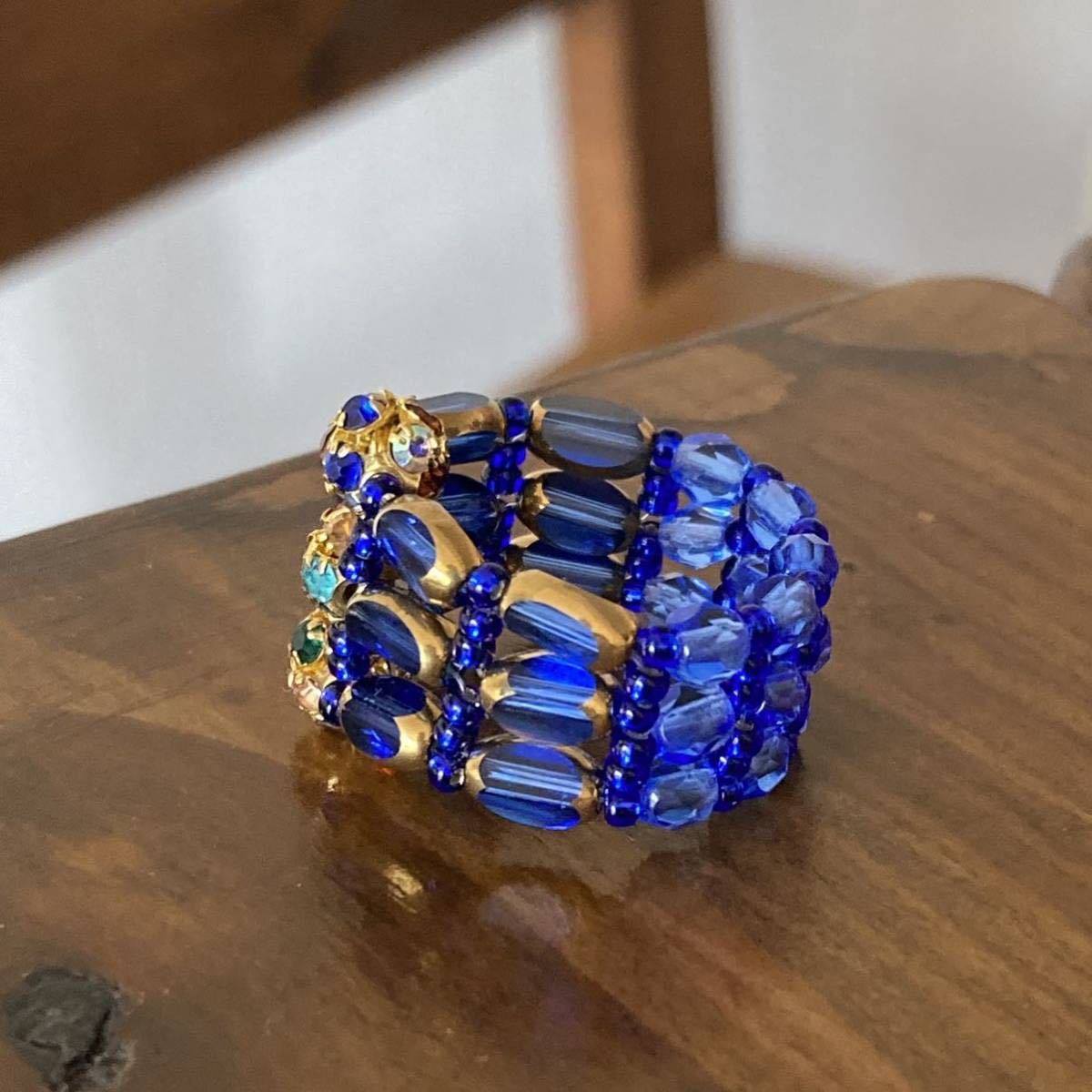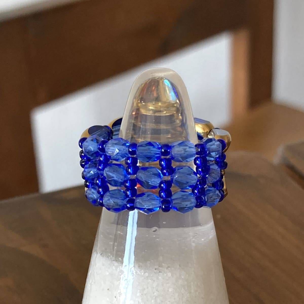 7mmのブルーのナツメガラスビーズ、中心は6mmのゴールドにカラフルなラインストーンの丸ロンデル3個、4mmのブルーのチェコビーズ、ブルーの丸小ビーズで作ったリングです。