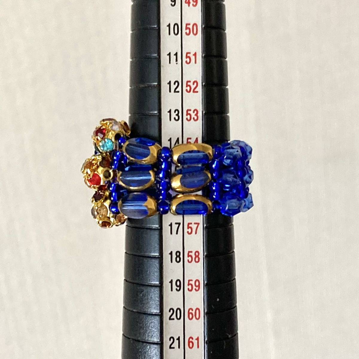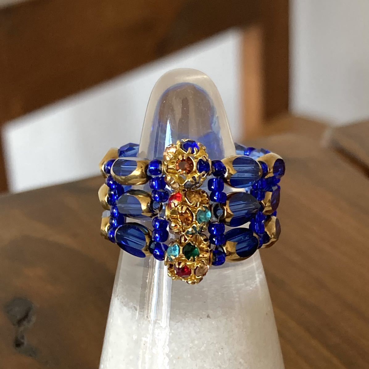 ビーズ リング 指輪 ハンドメイド カラフルなラインストーン3個とナツメビーズのリング ブルー×ゴールド 14ー16号です。