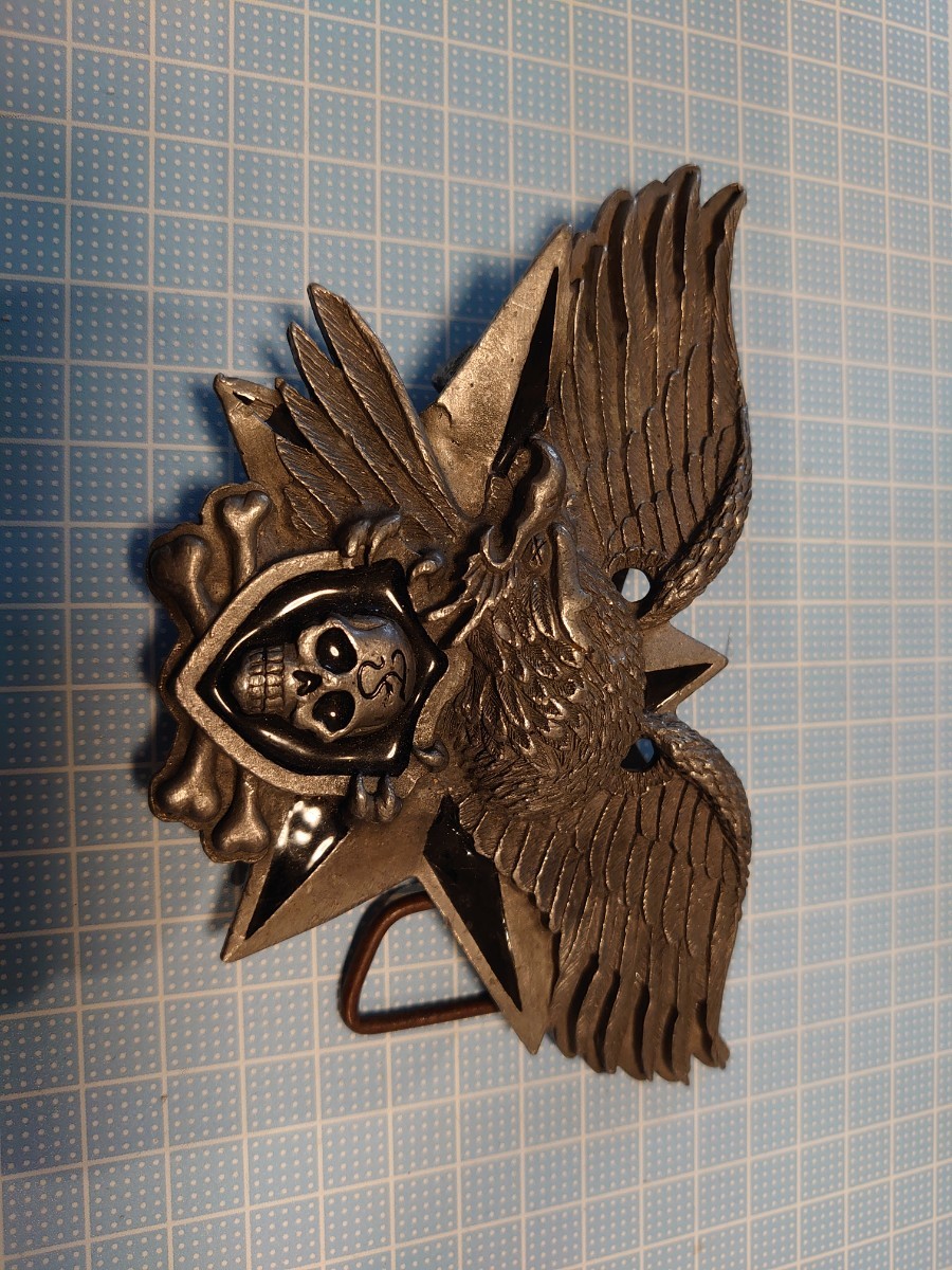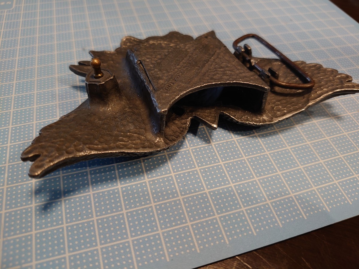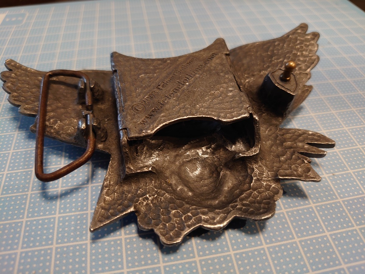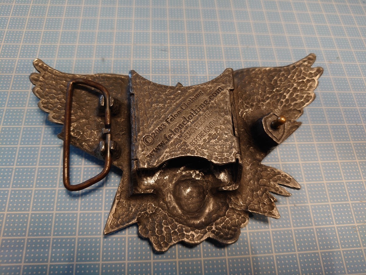 ライターが入ると言う話ですが一般のジッポだと厚くて入らないようです。もっと薄いものでないと入りません。い仕上げのベルトバックルです。それなりの変色や小傷などがございます。色は写真が実物と異なって見える場合もあるようです。こちらはくすんだ銀色系のベースです。苦情返品なしでお願いいたします。ベルト巾45ミリくらいまでです。214gほど。