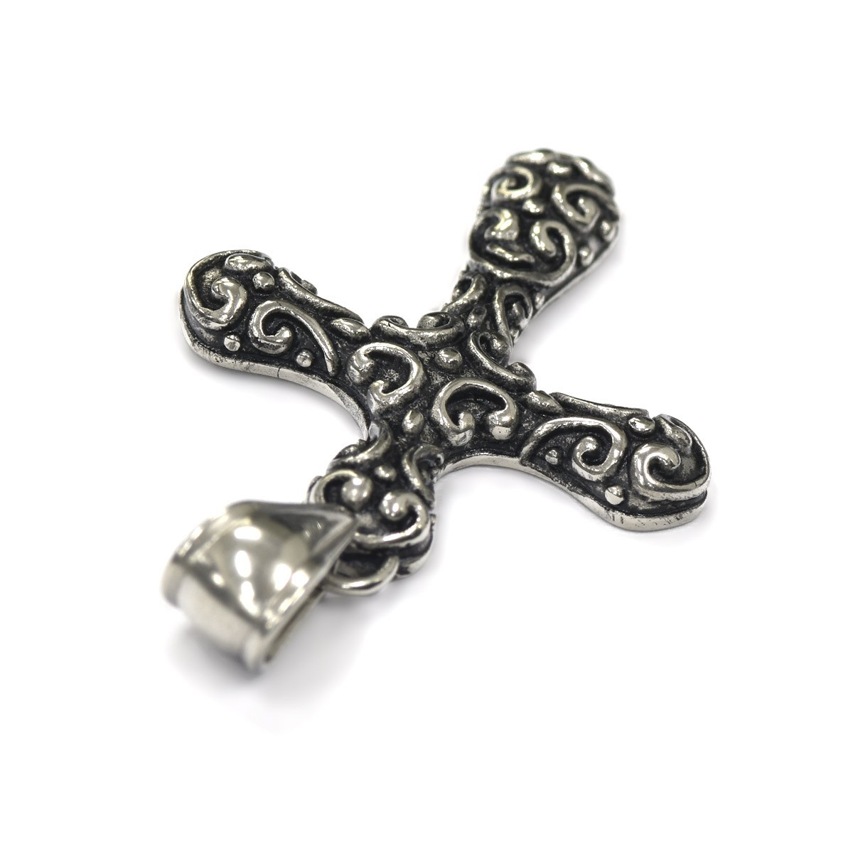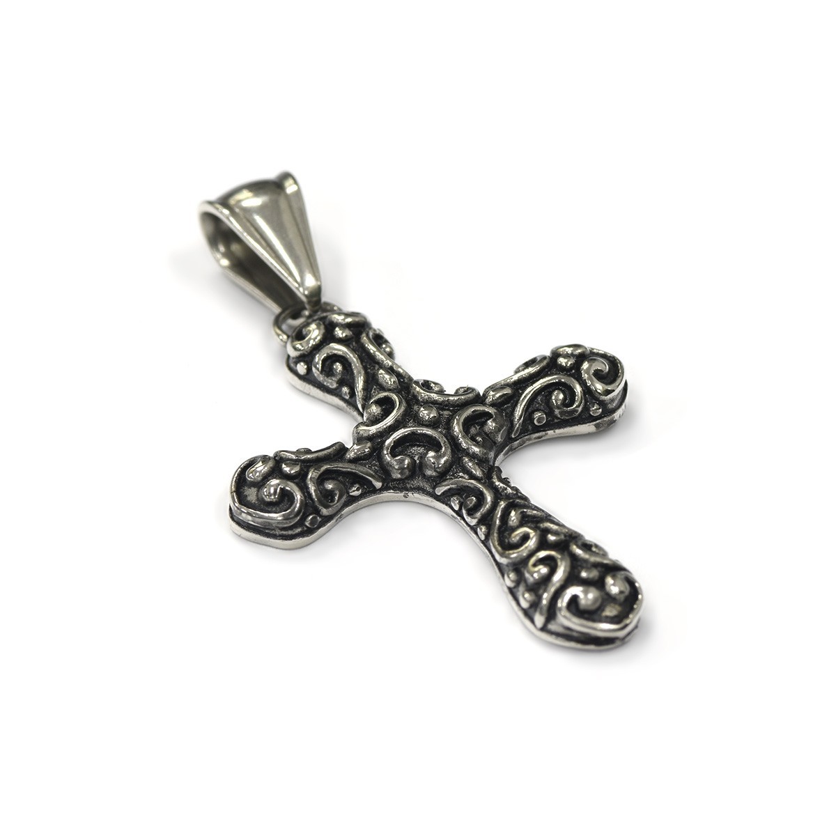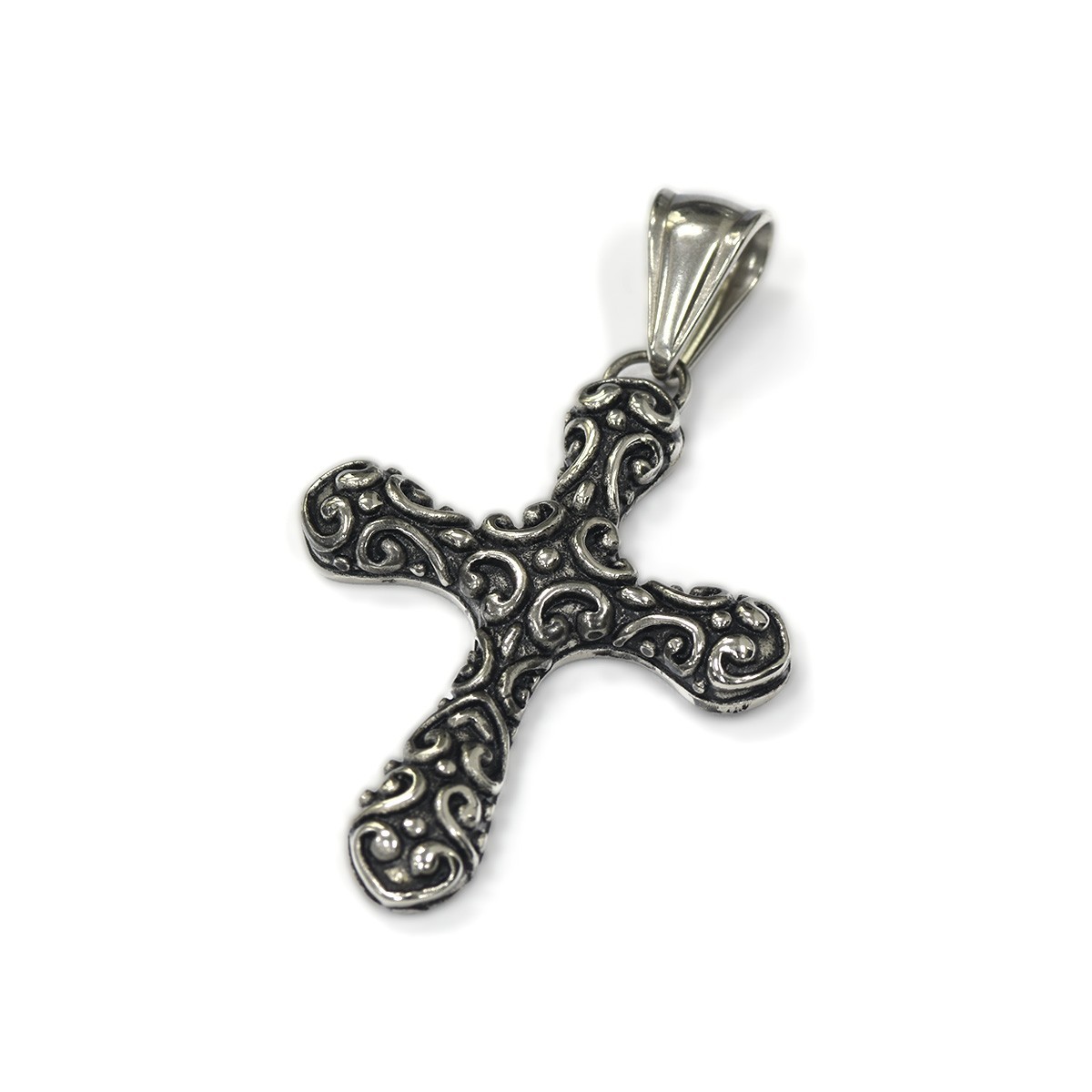 | クロス(十字架)に凝った模様が特徴的なペンダント。変わったデザインが好きな方にオススメです♪ 素材には本体・チェーン共に金属アレルギーに強いステンレスを使用。 |