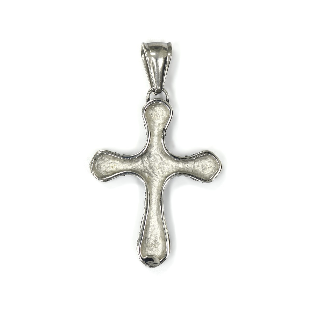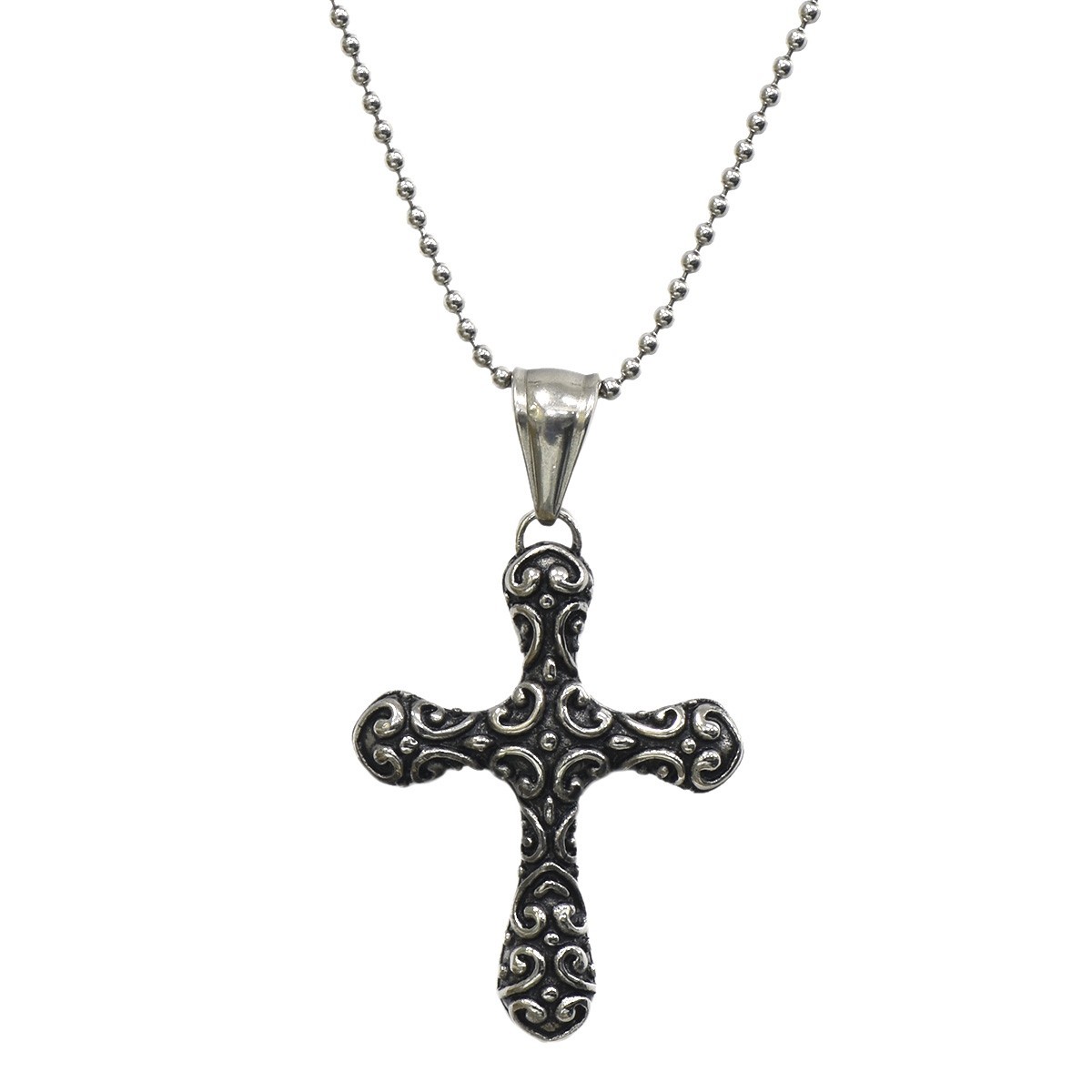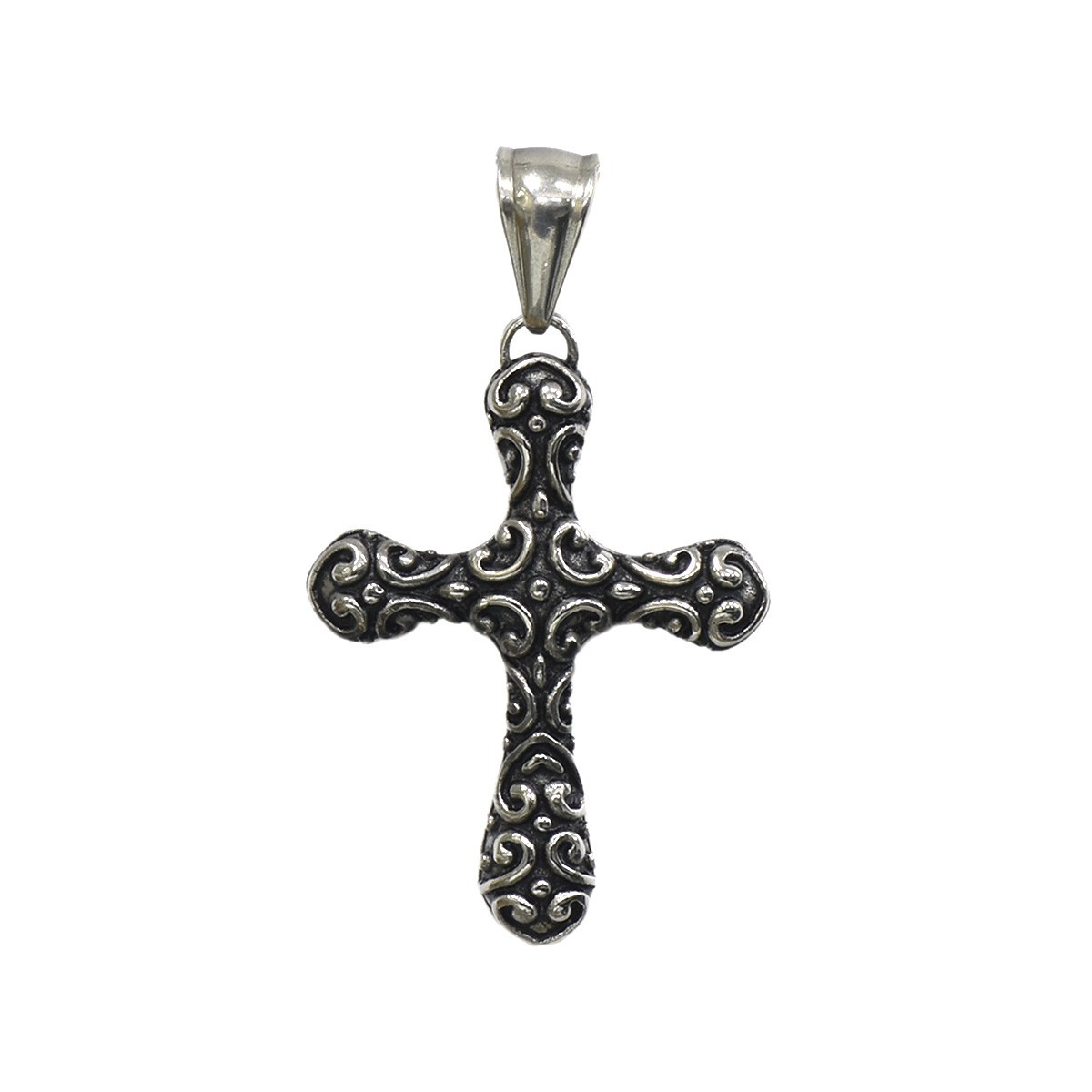 | クロス(十字架)に凝った模様が特徴的なペンダント。変わったデザインが好きな方にオススメです♪ 素材には本体・チェーン共に金属アレルギーに強いステンレスを使用。 |