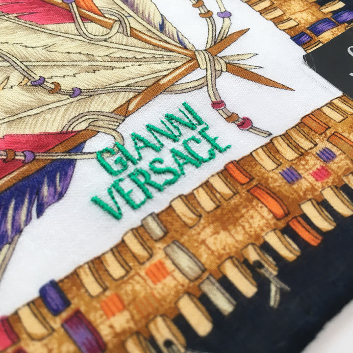 右下のグリーンのロゴ(GIANNI VERSACE)は刺繍です。