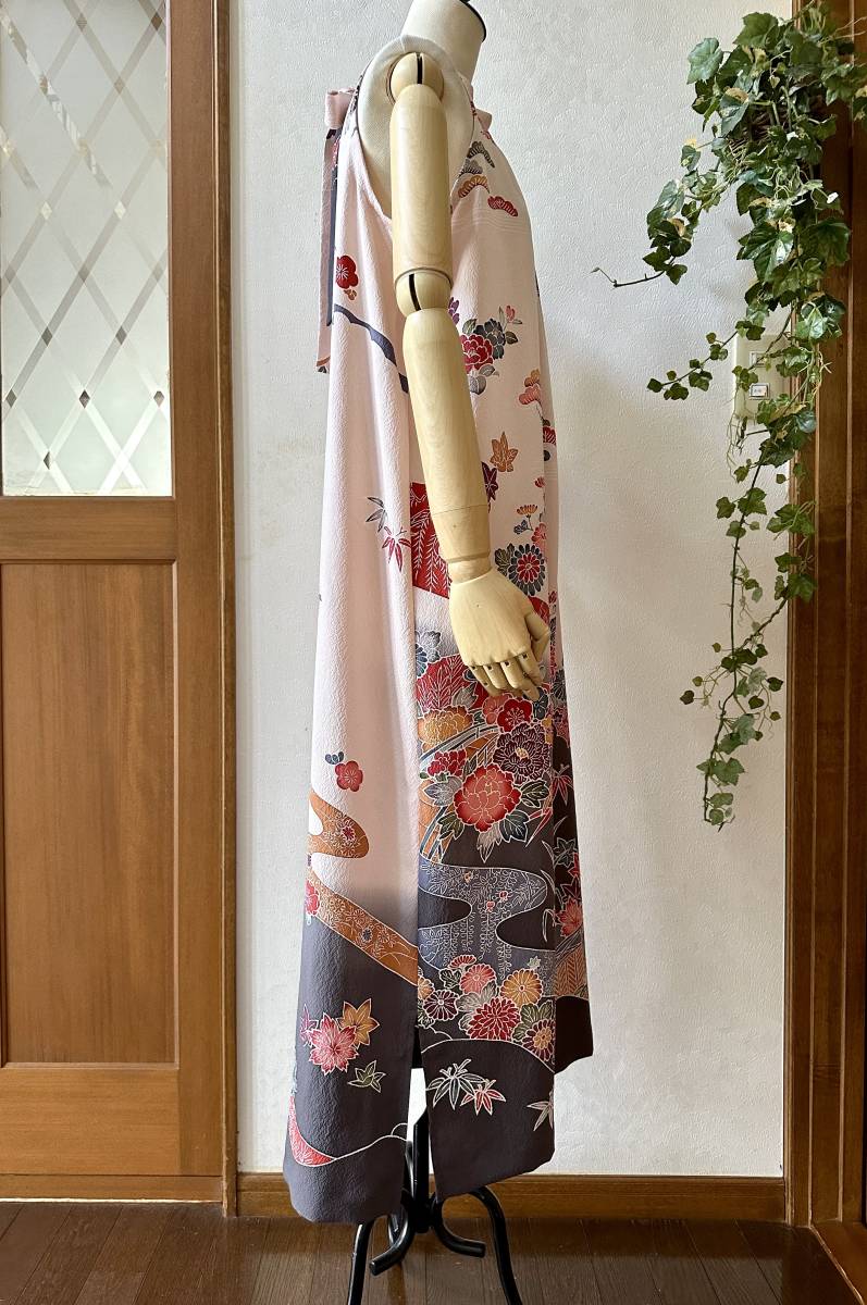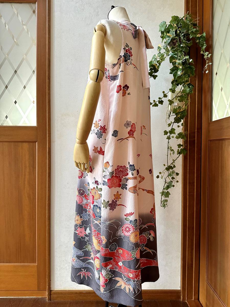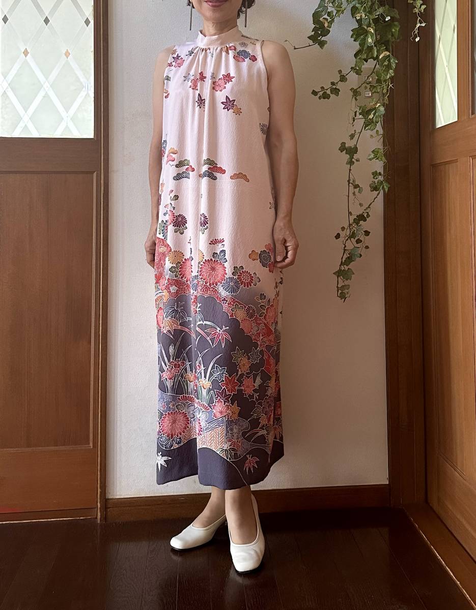 着物リメイクワンピース、セットアップ、古典柄、和風、薄いピンク色、ノースリーブ、ロールカラー、後ろリボン、1点もの、オリジナル