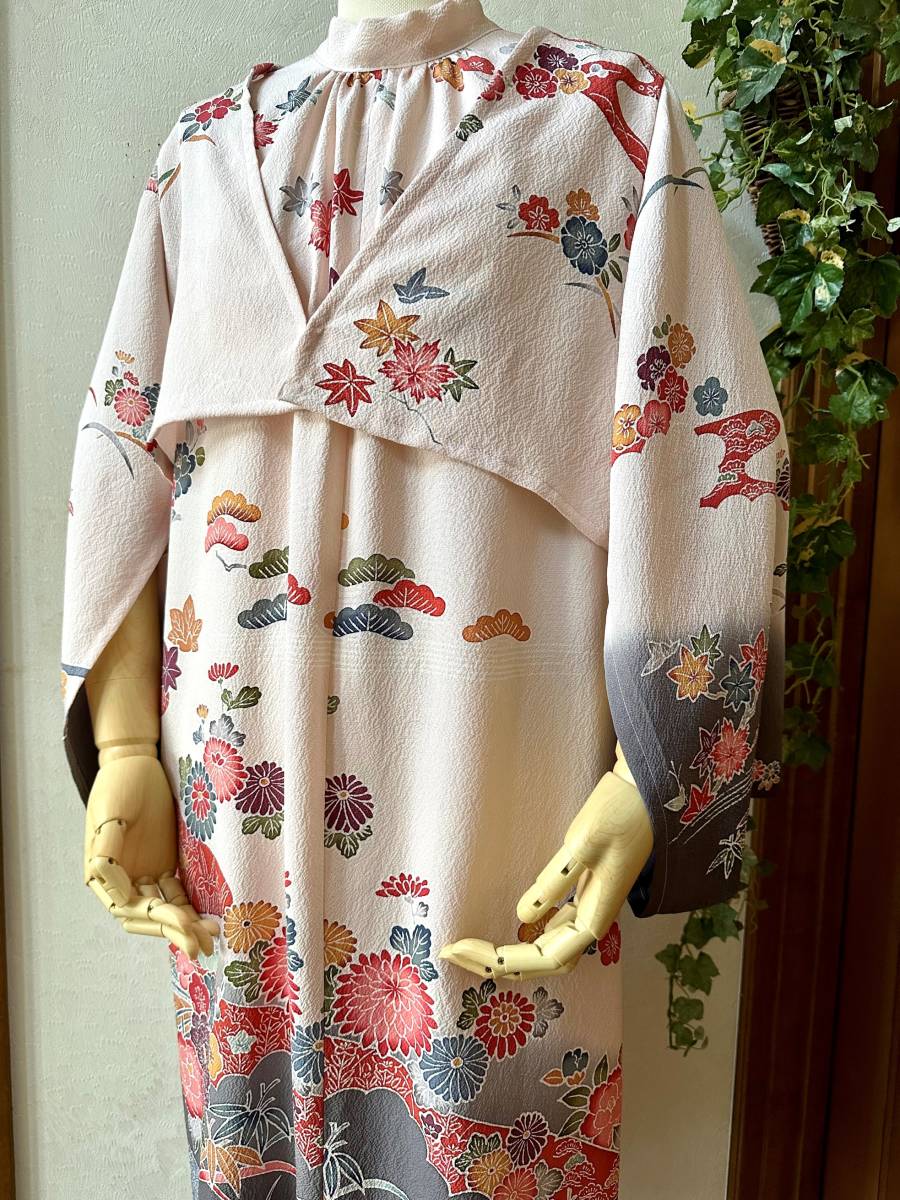 絹素材でしなやかな着心地で着物の高級感と存在感がある着物リメイクの良い特徴です。