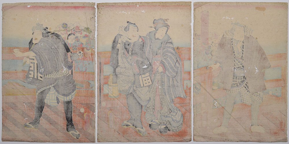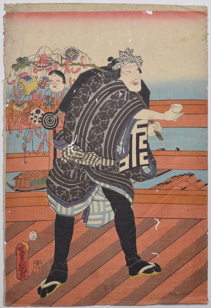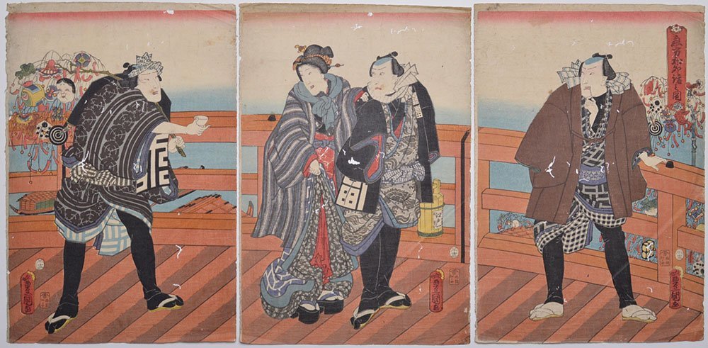 三代豊国の浮世絵三枚続きです。 背景と左図の人物の持物に新年の初卯詣の繭玉が描かれています。 顔とポーズから役者絵かと思われます。 経年による傷みあります。 絵師 歌川国貞=三代歌川豊国 寸法 大判 一枚のサイズ縦約37cm×横約25.5cm 状態 虫食い穴 汚れ シワ 折れ跡 端欠け 制作年 安政5年 |