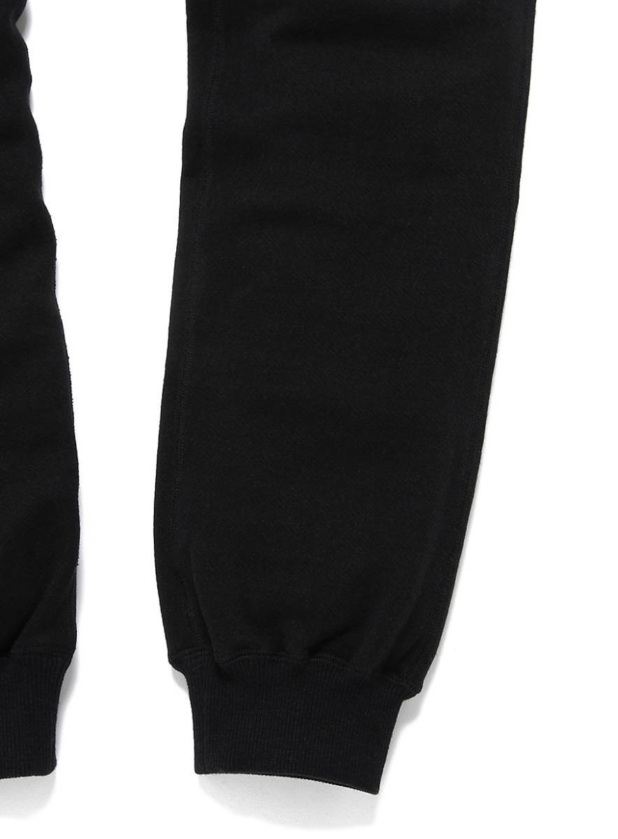 コットンシルクの糸をヘリンボン柄で編み立てた裏毛生地のスウェットパンツです。細身のシルエットながらも股にマチを付け、膝の関節部分に切り替えを入れ動きやすくストレスの無い着用感です。縫製は4本針フラットシーマと3本針を使い分け、綿糸で縫製してあります。